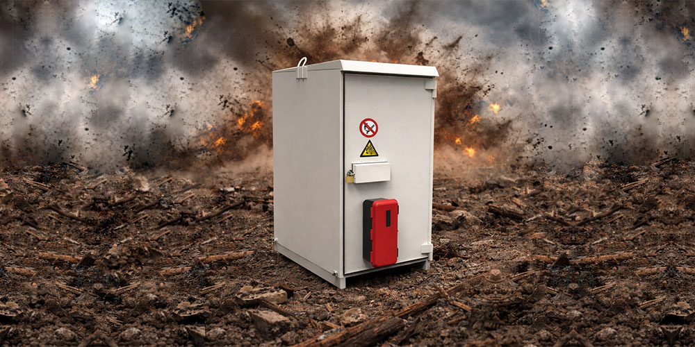 Här hittar du godkända sprängskåp, dynamitskåp och sprängkistor. Alla våra skåp är certifierade av SBSC och lever upp till den europeiska standarden EN-1143-1. Skåpen följer statens regelverk för förvaring av explosiva varor, inklusive brandsläckare och obligatoriska varningsskyltar.