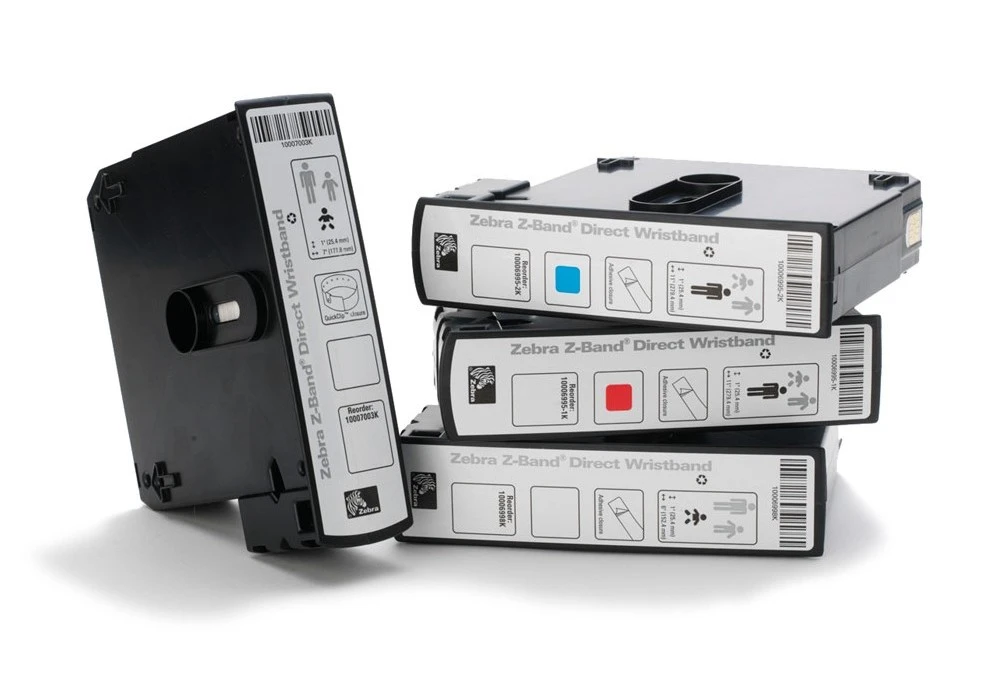 Band för armbandsskrivare i flera färger. Passar i Zebra HC100 & ZD510 armbandsskrivare. Flerdagsband för längre användning. Tål vatten. 25x254 mm.