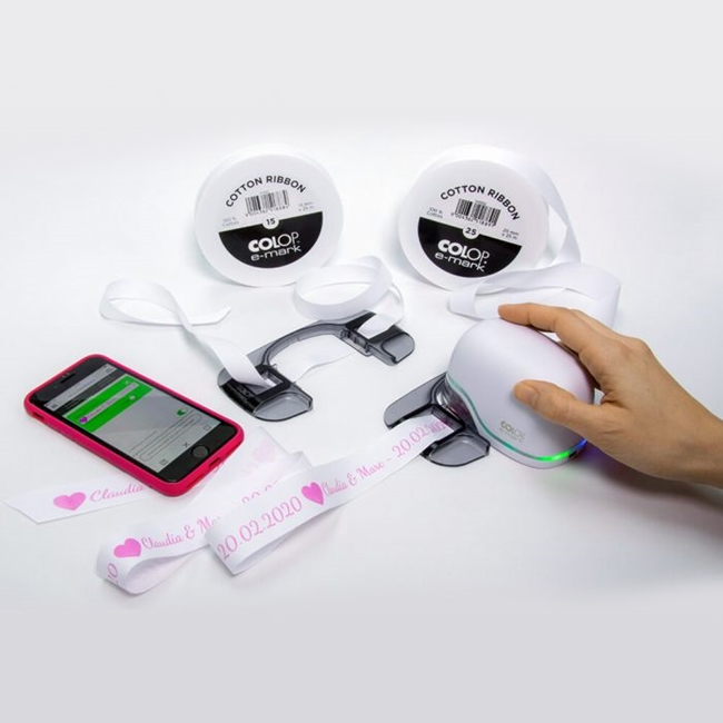 Dra t.ex. våra bomullsband genom bandledaren och håll din COLOP e-mark i sidled för att skapa snygga dekorationer.
