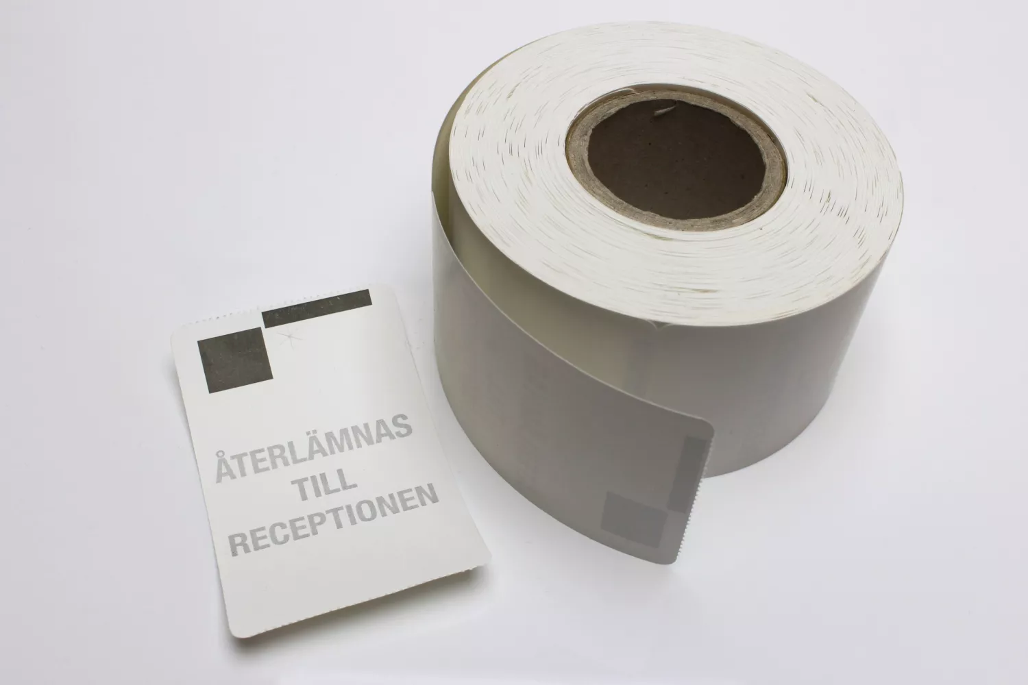 På baksidan av etiketten finns en förtryckt text som lyder: "ÅTERLÄMNAS TILL RECEPTIONEN" + blackmark + kryss (BB-3). Perforering mellan etiketterna och raka hörn.