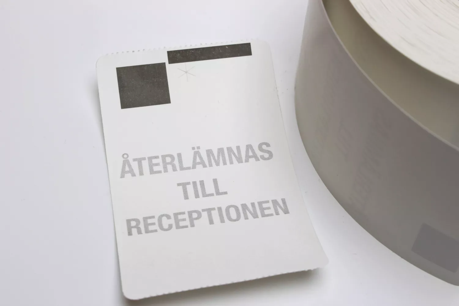 Besöksbiljetter, 54x86 mm, Text "ÅTERLÄMNAS TILL RECEPTIONEN", Rulle, DT, Läsmärke, 500 st/rulle