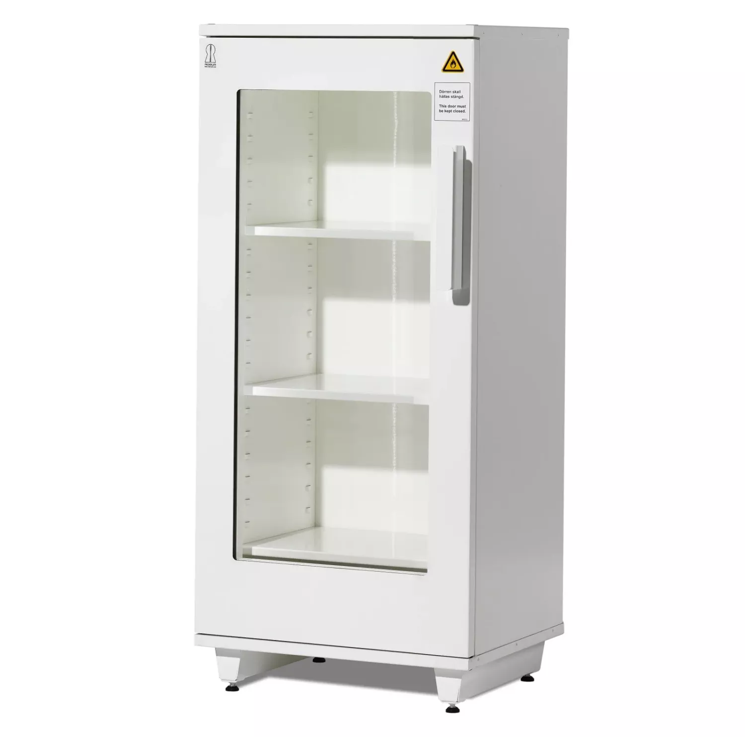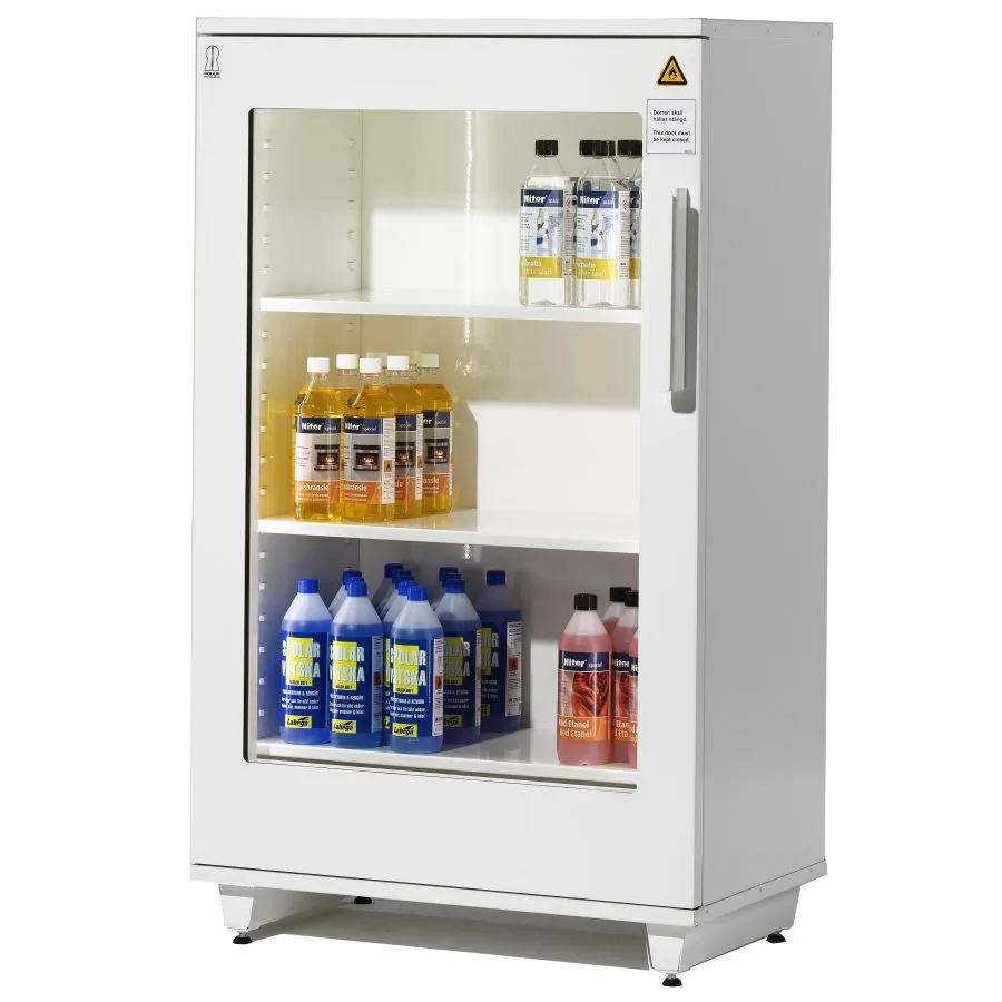 Brandavskiljande skåp BAS 240 rymmer 84 1-liters flaskor och är provat, certifierat och P-märkt av SP, Sveriges Provnings- och forskningsinstitut. Provning har utförts enligt SP metod 2369 och skåpen uppfyller kraven enligt SPs certifieringsregler SPCR 102. Skåpen är godkända enligt klass1 vilket tillåter förvaring av brandfarlig vätska eller aerosoler.