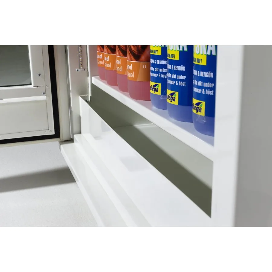 De flyttbara hyllorna kan sättas på önskad höjd genom att hyllbärarna placeras i urtagen i skåpets innerväggar. Hyllorna är godkända för en maxbelastning på 80 kg. I botten av skåpet finns ett spilltråg som är till för att samla upp eventuellt läckage från flaskor och burkar.
