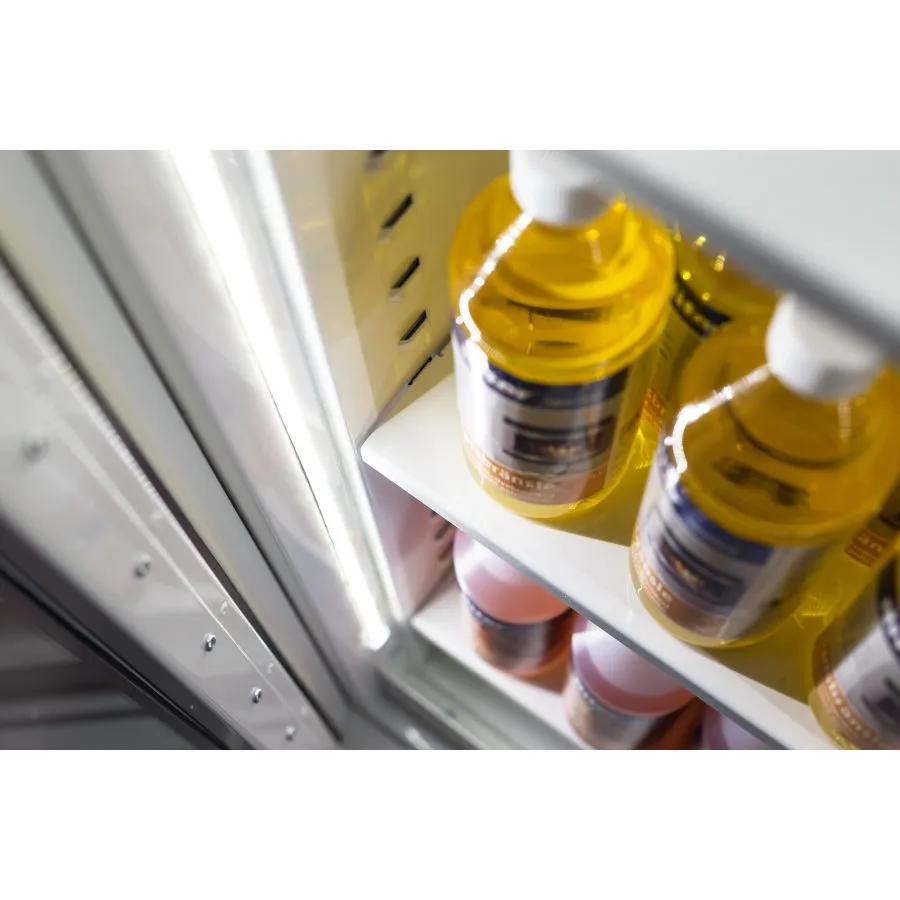 Produkterna exponeras tydligt genom den glasförsedda dörren. Som standard är skåpet försett med en högklassig energisnål LED-belysning som ger ett väl exponerande ljus, har låg energiförbrukning och lång livslängd.