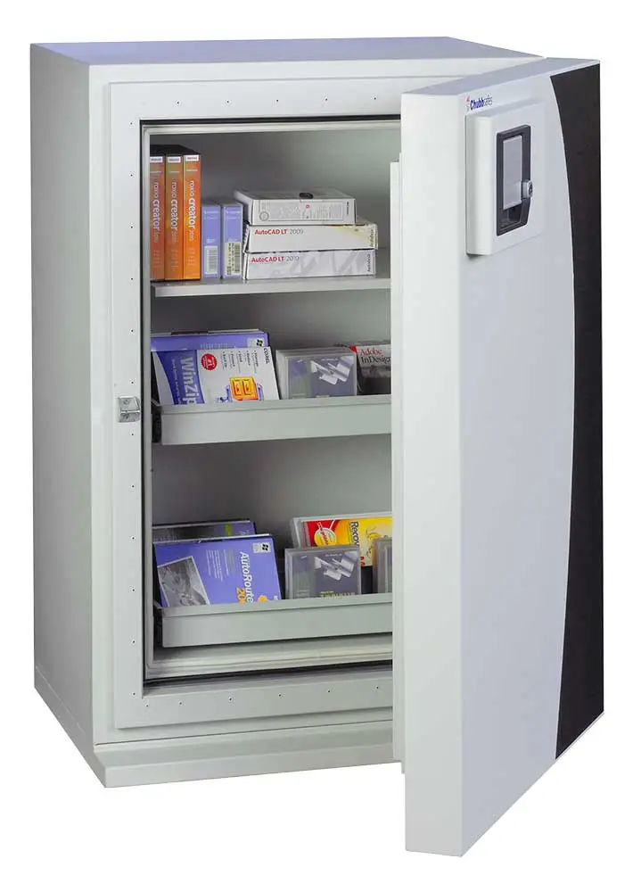 Brandklassat datamediaskåp med 120DIS-klassning. Denna skåpserie har en snabbstängningsfunktion, så kallad slam-action, som borgar för säkert skydd. Funktionen gör det möjligt att snabbt smälla igen dörren och samtidigt få fullgott brandskydd utan att manuellt behöva låsa skåpet först.