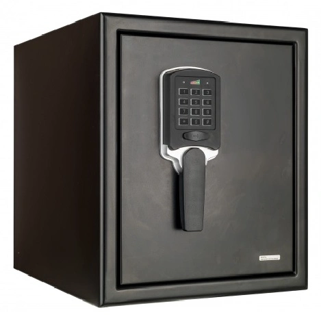 Utrustat med ett flyttbart hyllplan i plast och inbyggt elkodlås. Batterier bytes från utsidan och ingår vid leverans.