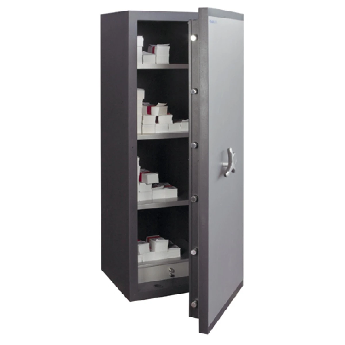 Det näst största värdeskåpet ur DG-serien, med certifieringen Grade 1 enligt EN-1143-1, för säker förvaring av dina värdeföremål och kontanter. Du får också 60 minuters certifierat brandskydd. Skåpet är stort och rymligt, och inrett med 3 hyllplan.
