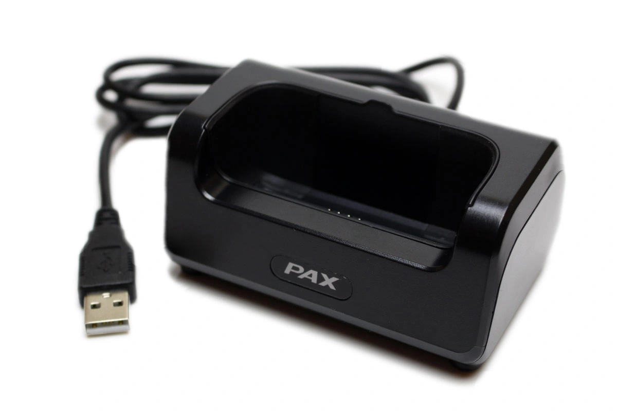 Dockningsstation med singel-plats för kortterminal myPOS Mini. Laddningsstationen ansluts via medföljande micro-USB-kabel. Kan antingen anslutas direkt till dator via USB-kontakten, eller till vägguttaget via den medföljande väggkontakten.