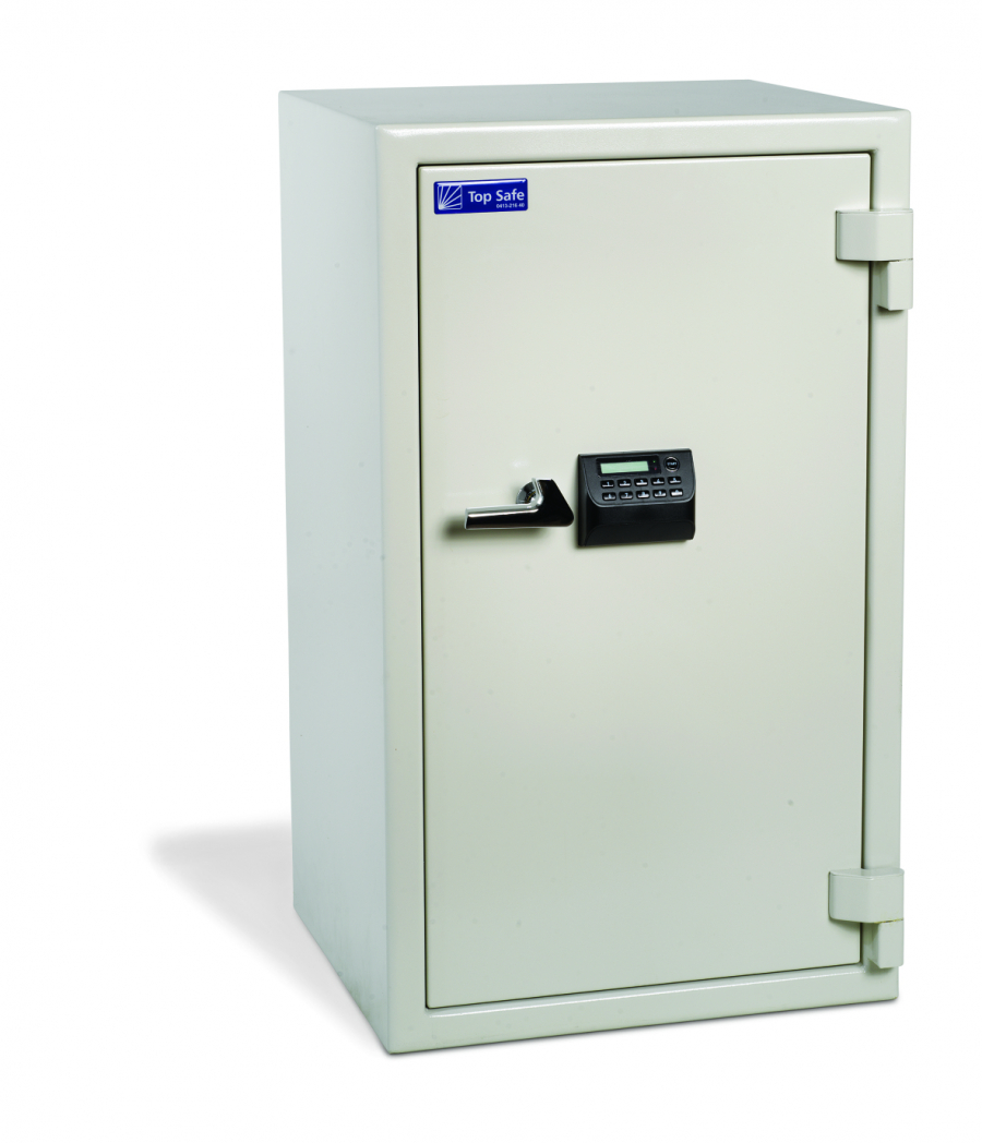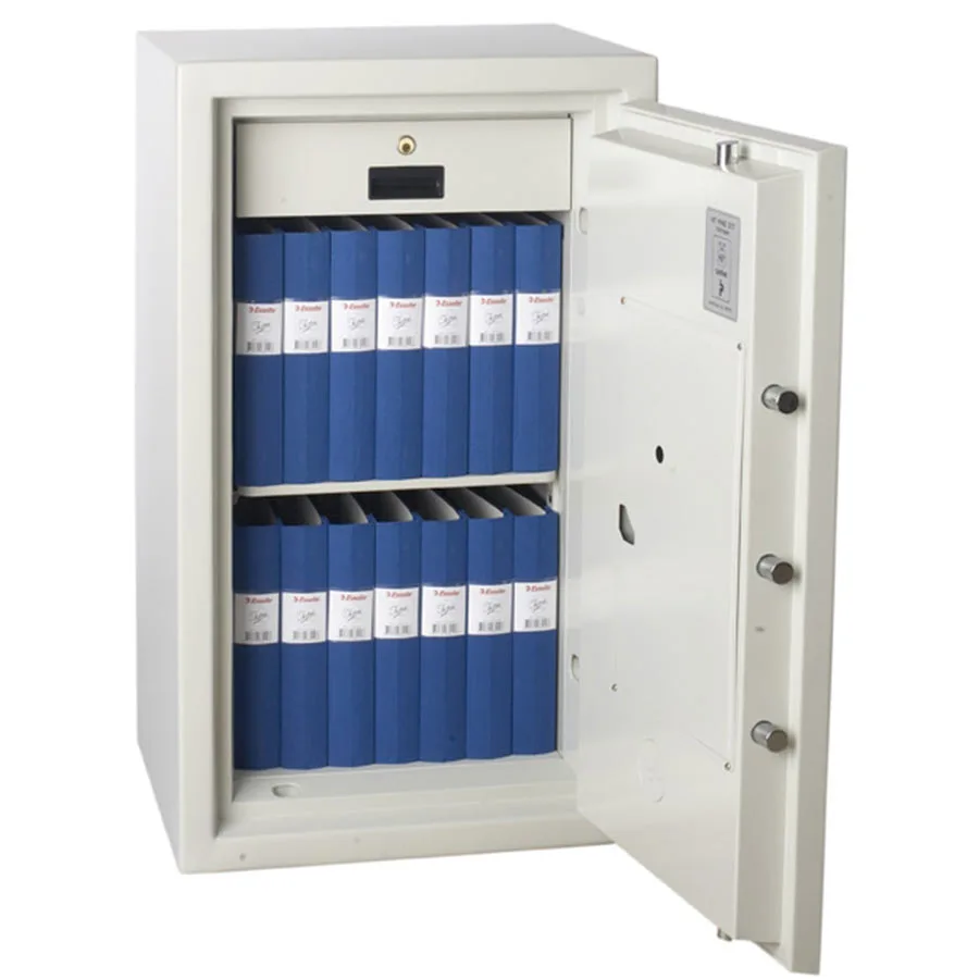 Rymligt dokumentskåp för förvaring av pappersdokument. Skåpen är testade att skydda papper i 2 timmar vid ca. 1000°C värme. Skåpet är utrustat med en robust dörr, med elektroniskt kodlås och praktiskt handtag.