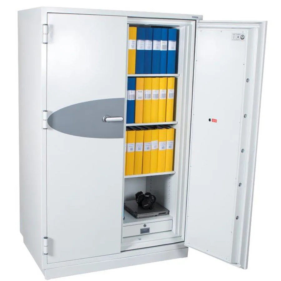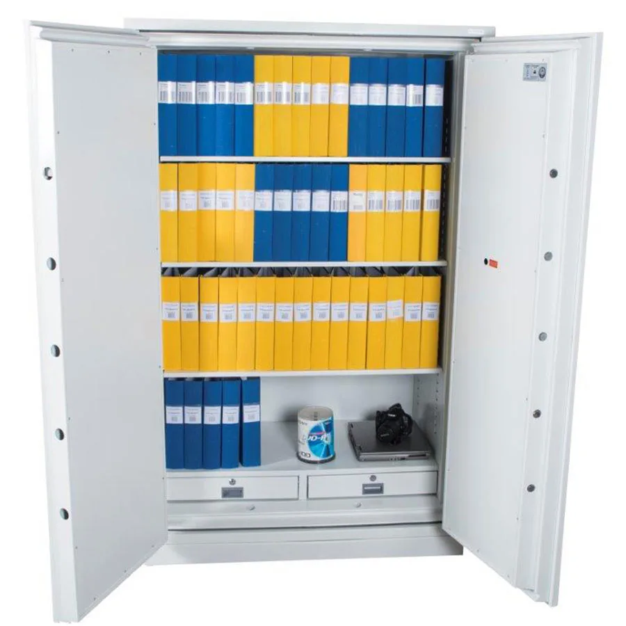 Ett mycket stort och rymligt dokumentskåp och mediaskåp som är testat att skydda papper i upp till 120 minuter och digitala medier i 60 minuter. Skåpet rymmer upp till 100 pärmar och kommer med 2 stycken låsbara lådor. Skåpet är standardutrustat med ett elektroniskt kodlås med två utbytbara koder samt tidsfördröjning vid upprepade felslag av koden.