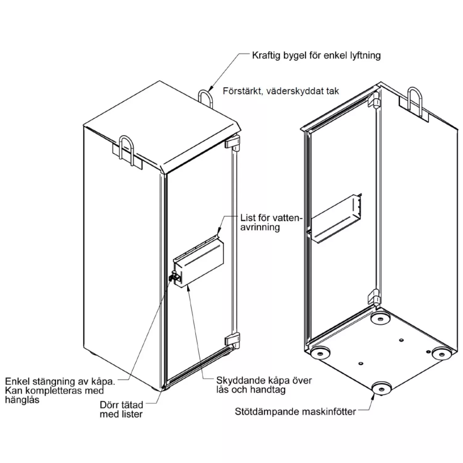 Skåptaket, som är väderskyddat, är utrustat med 2 st kraftiga byglar för att underlätta lyftning av skåpet, en list för vattenavrinning, skyddskåpa över handtag och lås och stötdämpande maskinfötter.