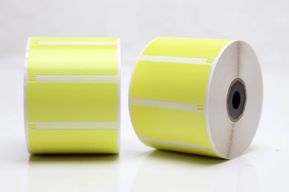 Gula klisteretiketter på rulle, 56x25 mm, 1000 st/rulle, 25,4 mm spole. Passar vanliga termoskrivare såsom Zebra ZD421d.