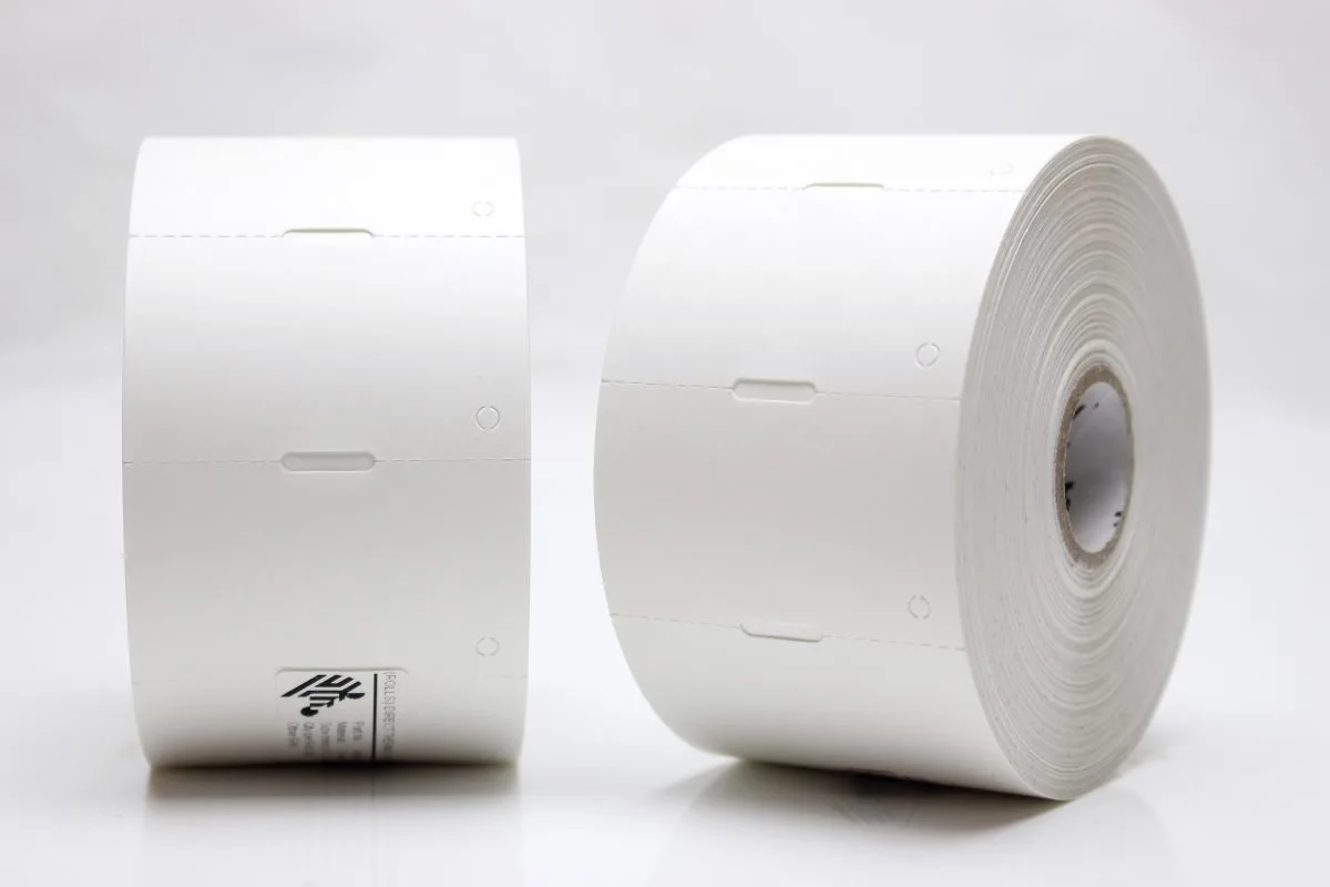 Avsedd för märkning av kläder, textilier, mm. Rullen är perforerad med avkänningsskåra, och har ett hängtaggshål för snören vid märkning av produkter.