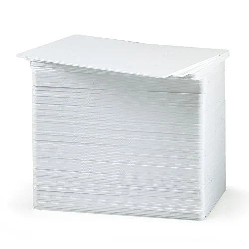 Vanliga vita plastkort i kreditkortsstorlek för användning i kortskrivare. Ingen magnetremsa. Paket med 500 kort.