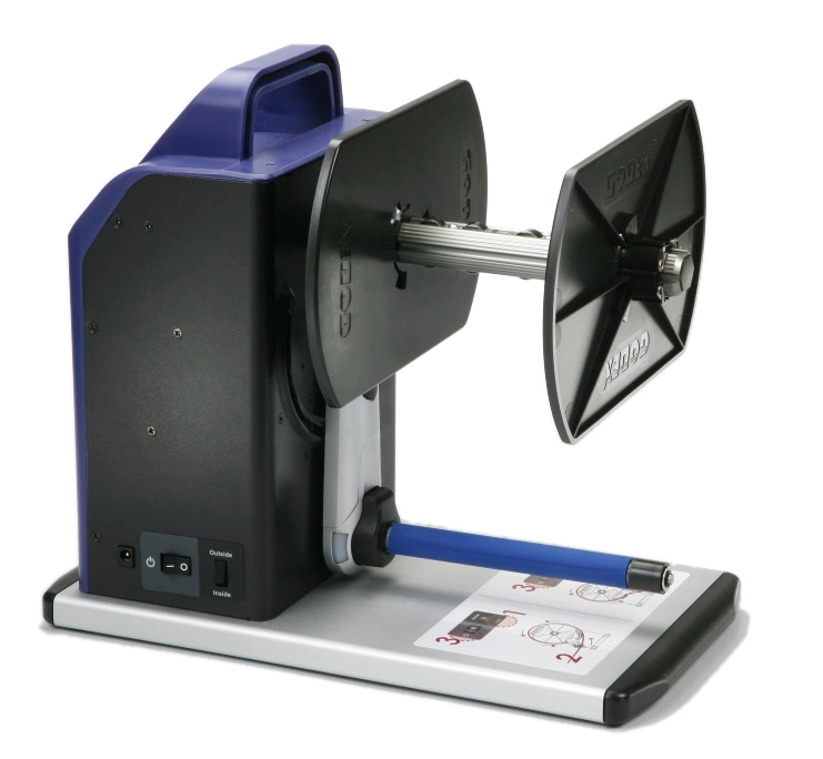 Upprullaren klarar upprullning med etiketterna både inåt eller utåt, och klarar en rullkärna på 25 mm (utan adapter), 38 mm, 40 mm och 76 mm (vilket kräver montering av adapter som ingår i paketet).