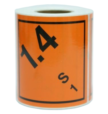 Rulle med 250 st farligt gods-etiketter för klass 1, riskgrupp 1.4 explosiva ämnen och föremål (riskgrupp 1.4 innefattar ämnen eller föremål med obetydlig risk vid antändning), samhanteringsgrupp S. Klass 1 innefattar ammunition, sprängämnen, tändmedel och pyrotekniska varor. De vanligaste pyrotekniska varorna är fyrverkerier och pyroteknisk säkerhetsutrustning.