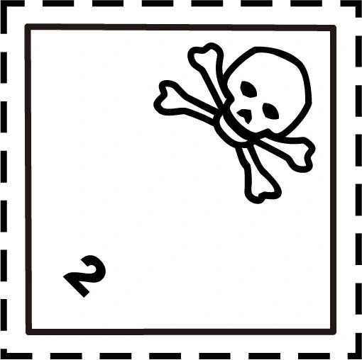 Beskrivning av symbol: dödskalle med korsande benknotor, svart på vit bakgrund, siffran 2 i nedre hörnet.