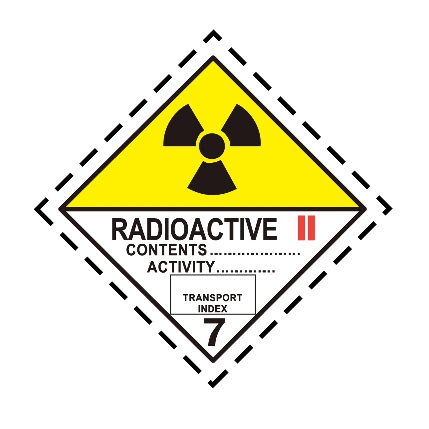 Beskrivning av symbol: strålningssymbol, svart på gul bakgrund med vit kant (övre hälften). Vit bakgrund (nedre hälften). Text (obligatorisk): svart på etikettens nedre hälft: RADIOACTIVE, CONTENTS..., ACTIVITY..., samt i ett fält med svart inramning: TRANSPORT INDEX. På uttrycket RADIOACTIVE följer två lodräta röda streck. Siffran 7 i nedre hörnet.