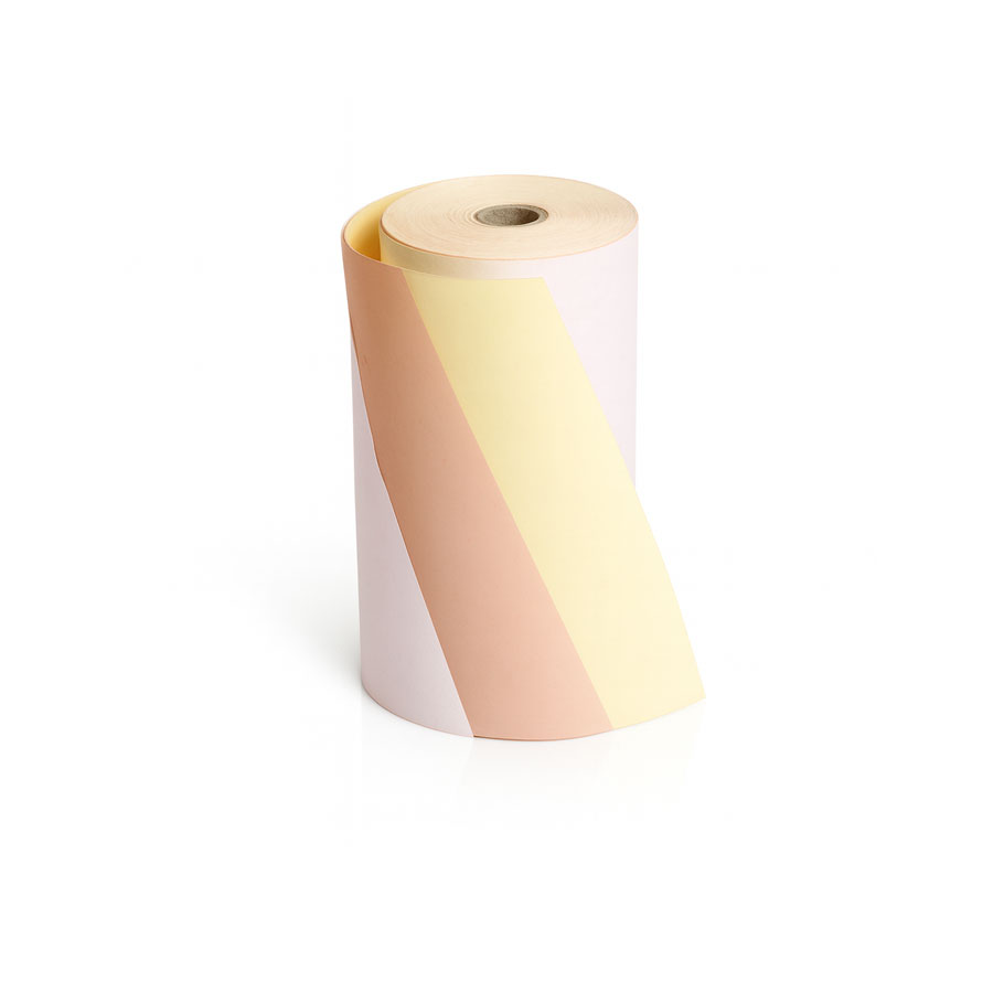 Trebanigt kvittopapper med 3 färger för kvittokopior (vit, rosa, gul). Gjord för bl.a. köksskrivare (ej thermopapper). Bredd: 114, längd: 15 m, Ø65 mm