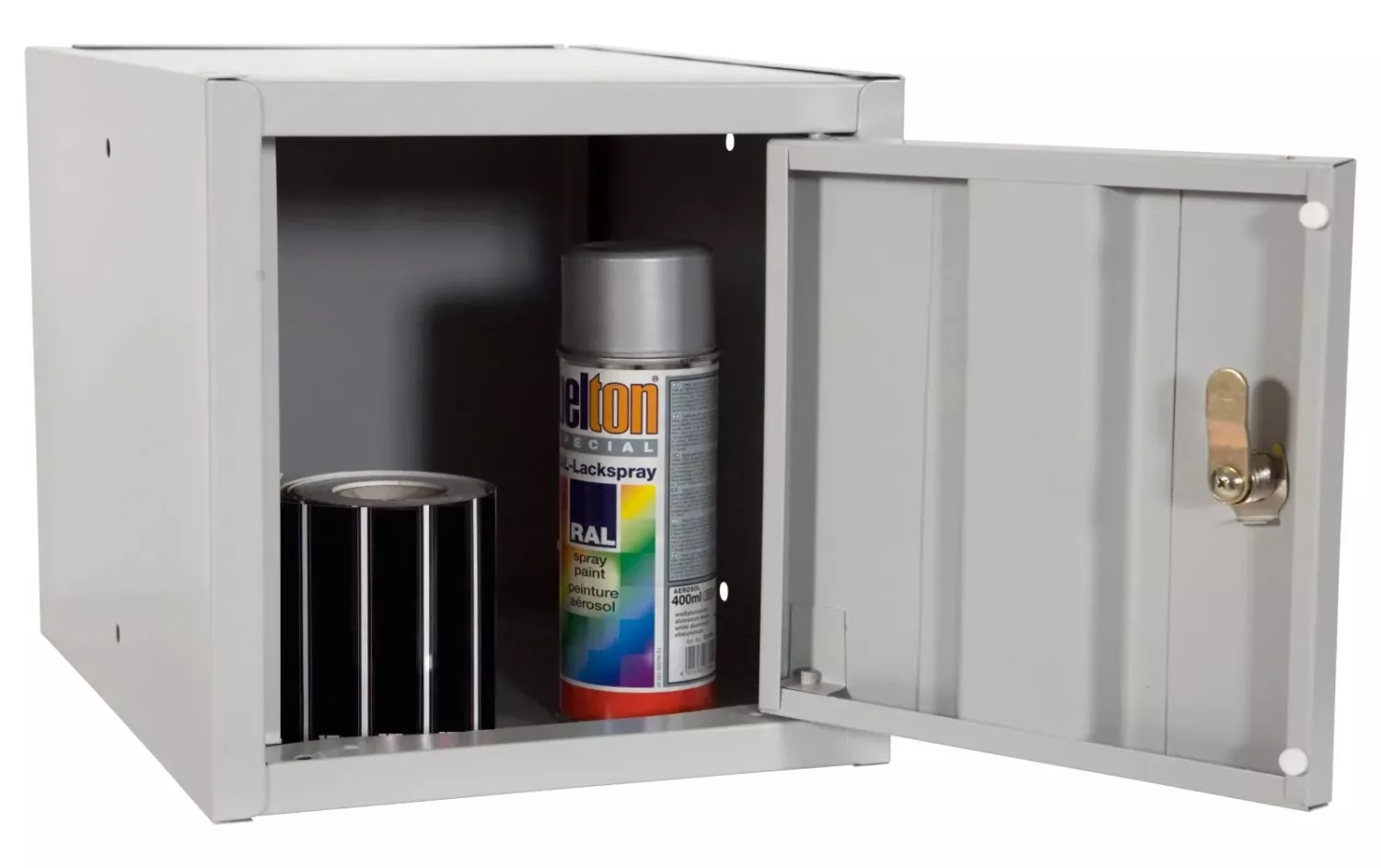 Litet & enkelt förvaringsskåp i plåt med cylinderlås, för förvaring av t.ex. kontorsmaterial, verktyg m.m. Höjd: 275 mm, bredd: 275 mm, djup: 355 mm.