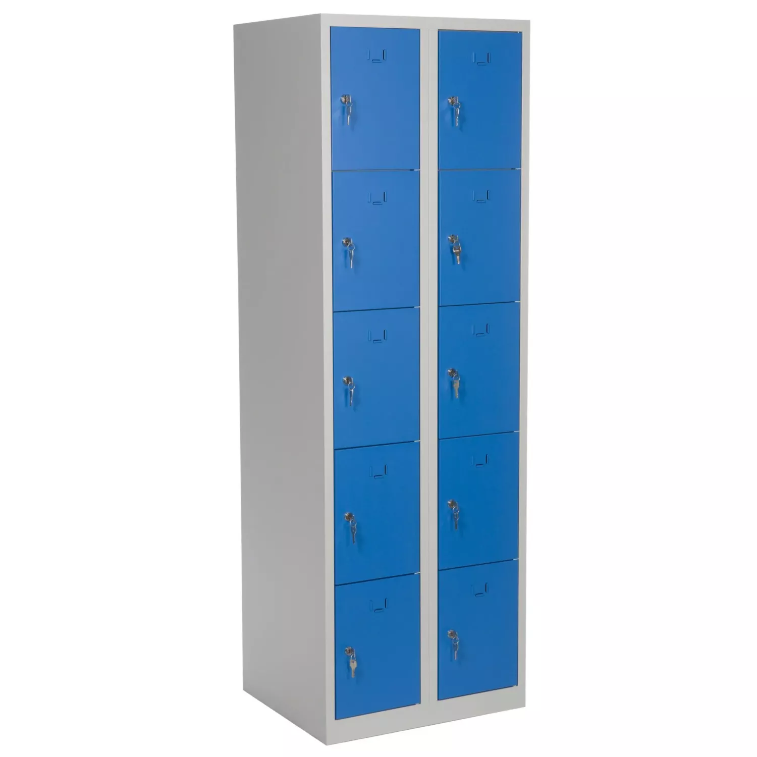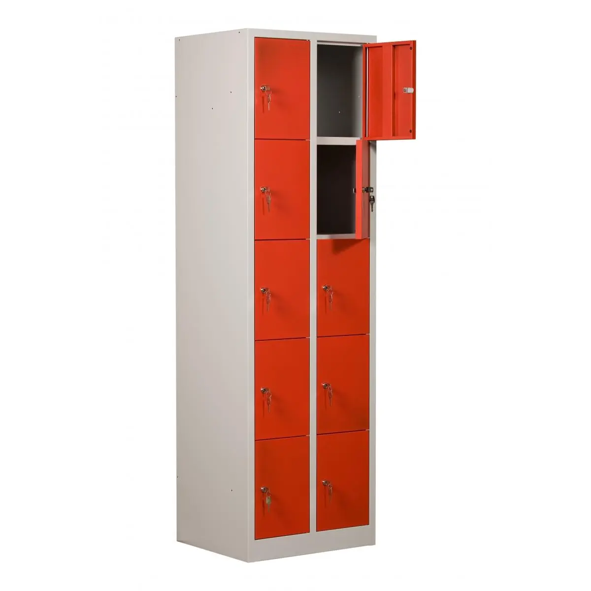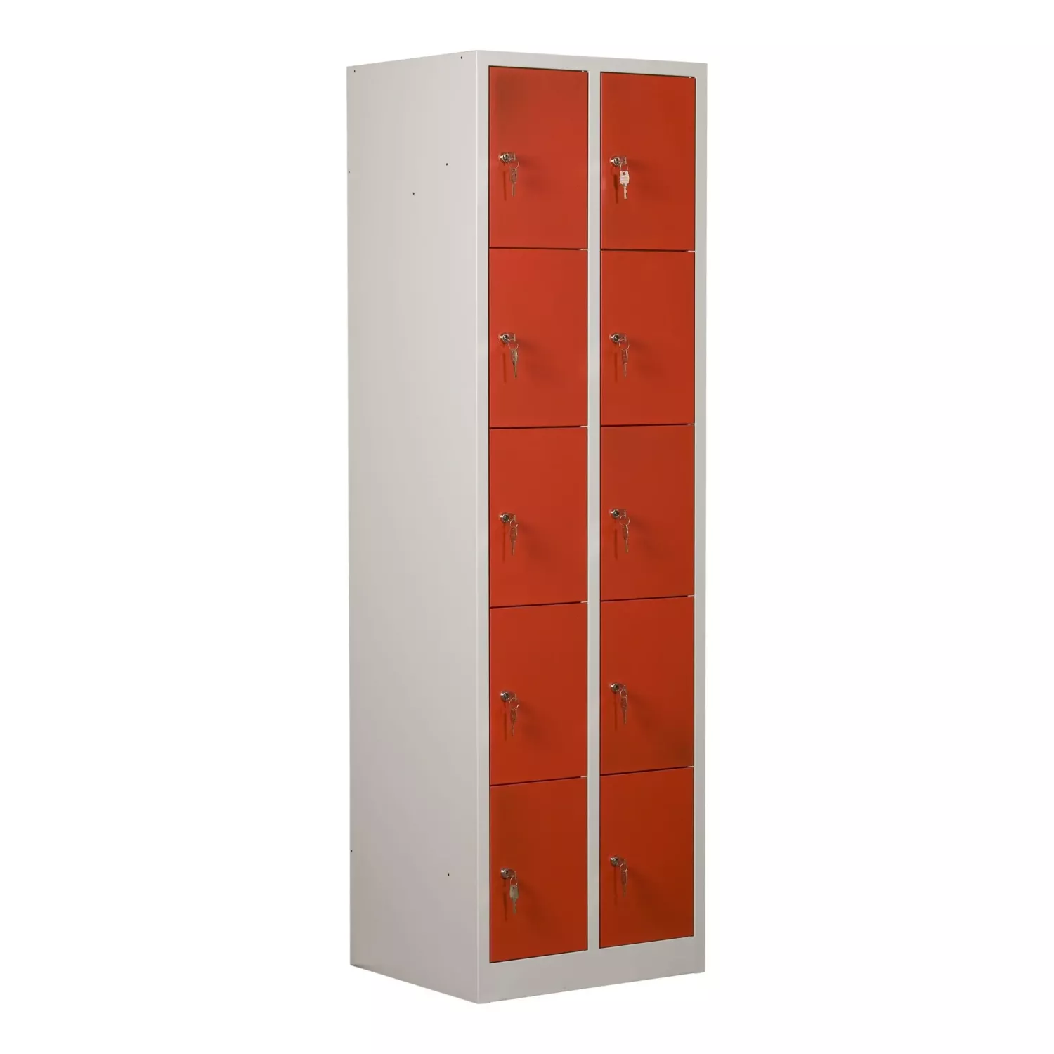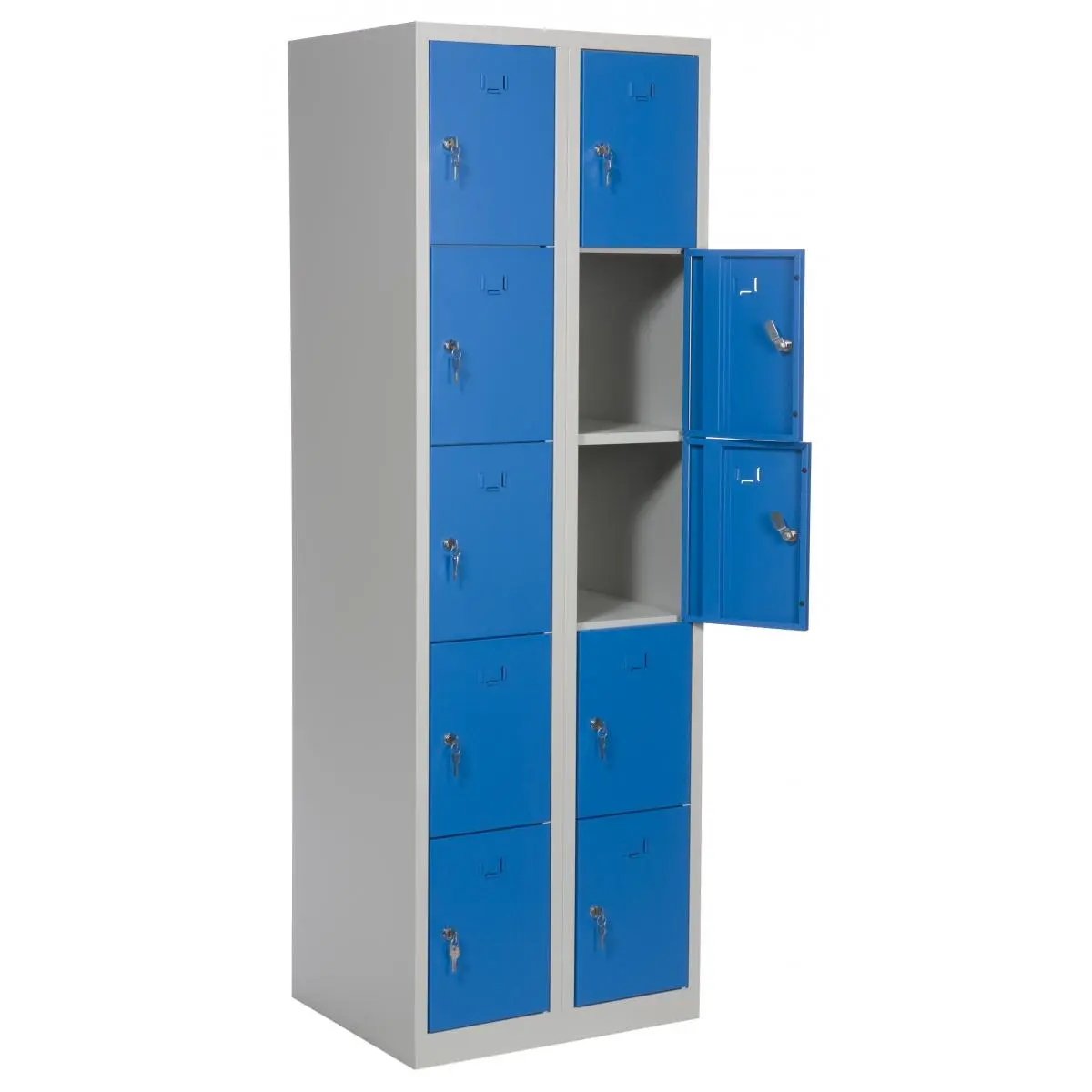 Förvaringsskåp med 10 förvaringsfack i två kolumner. Helsvetsad stålkonstruktion borgar för en stabil och robust skåpkropp som tål lite slit och användning. Perfekt för t.ex. badhus, gym eller skolor.