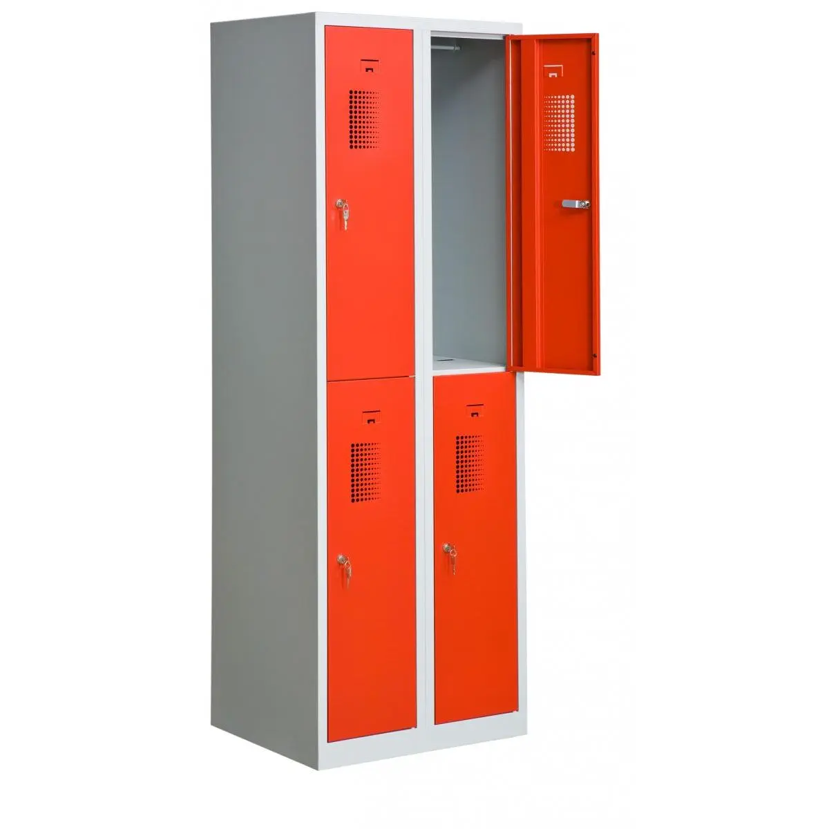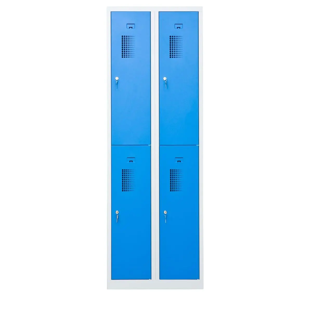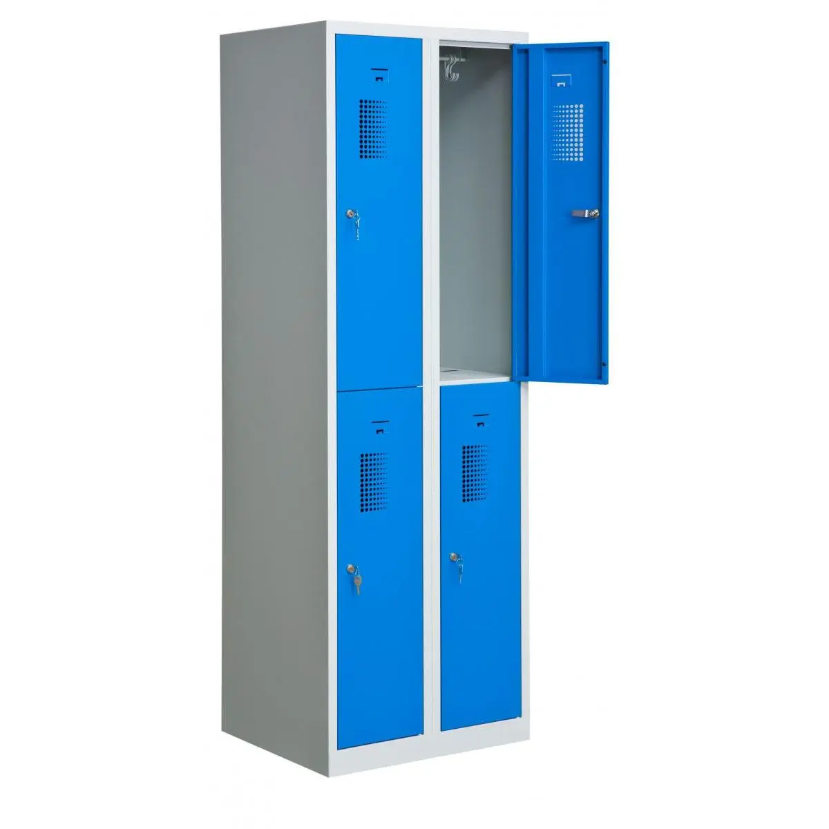 Förvaringsskåp med 4 förvaringsfack i två kolumner. Helsvetsad stålkonstruktion borgar för en stabil och robust skåpkropp som tål lite slit och användning. Perfekt för t.ex. badhus, gym eller skolor.