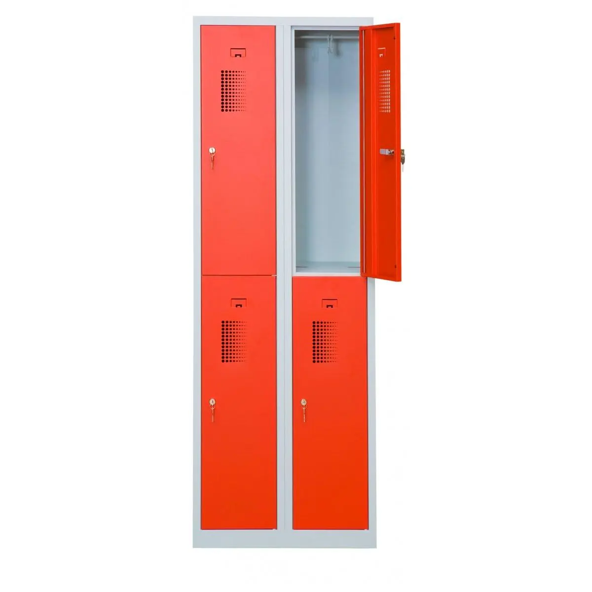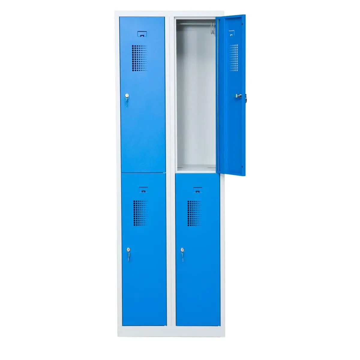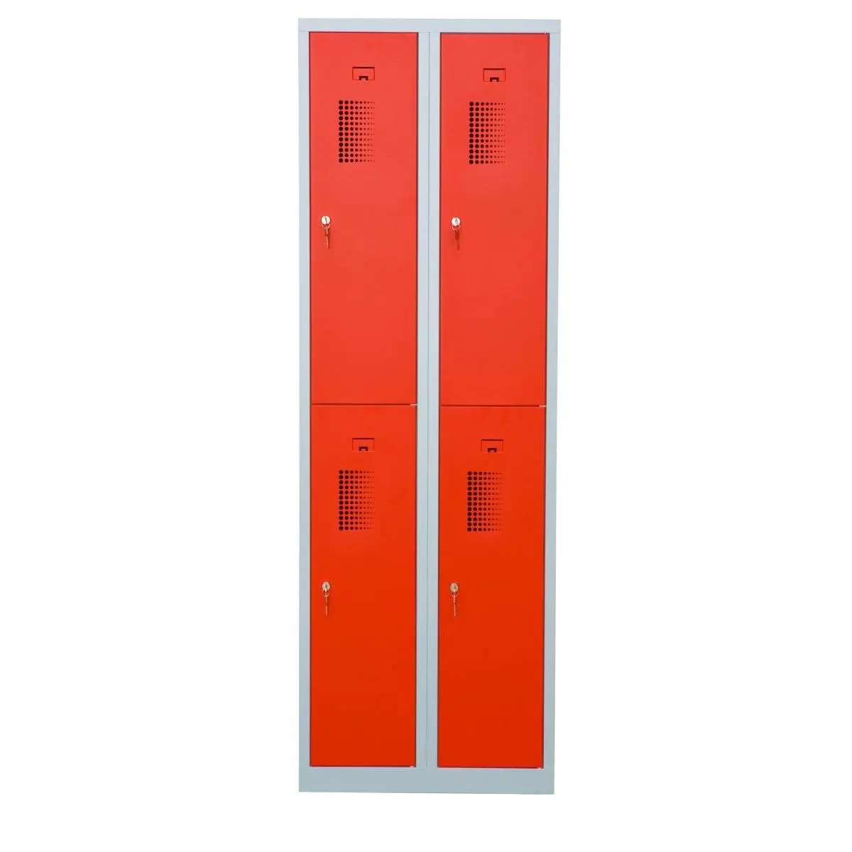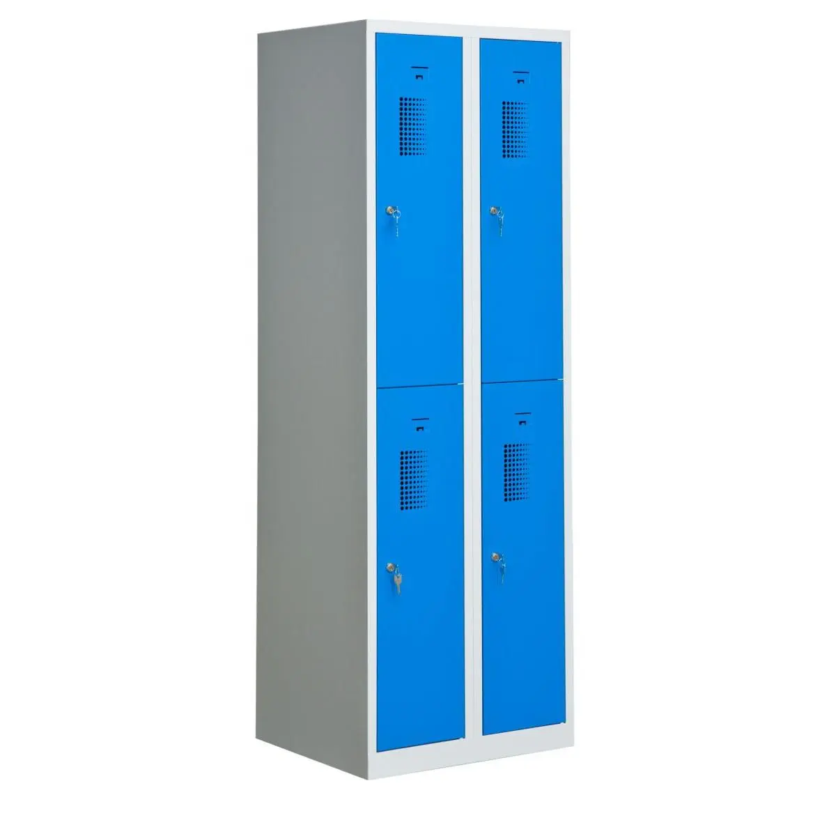 Förvaringsskåp med 4 förvaringsfack i två kolumner. Helsvetsad stålkonstruktion borgar för en stabil och robust skåpkropp som tål lite slit och användning. Perfekt för t.ex. badhus, gym eller skolor.