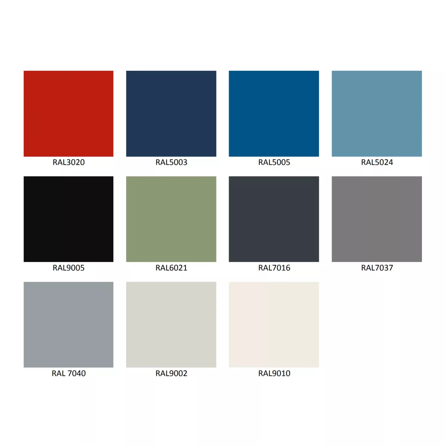 Skåpen har en matt, gråvit pulverlack i helfärg. Vid behov går luckorna att få i röd, mörkblå, blå, ljusblå, svart, grön, mörkgrå, grå, ljusgrå, och gräddvit (se färgkarta ovan), mot längre leveranstid. Kontakta gärna oss för pris och leveranstid på skåp i andra färger.