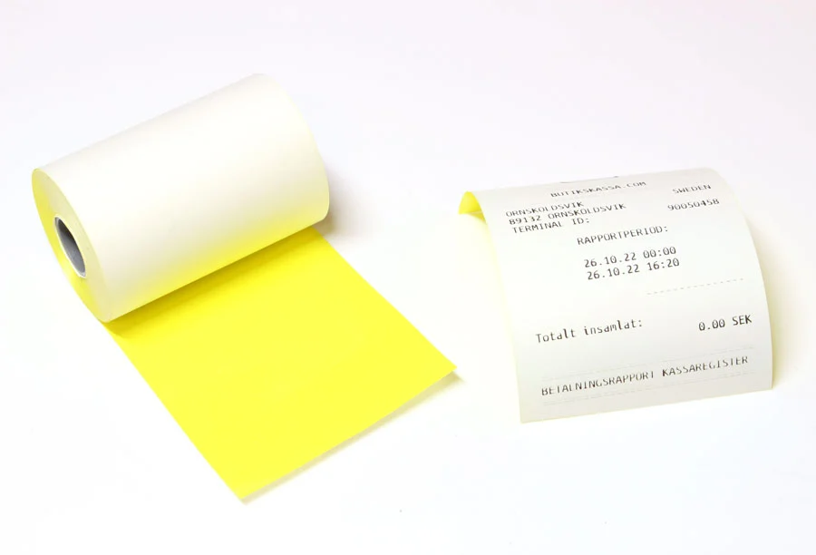Gula termokvittorullar i syntetmaterial som inte går att riva sönder och som tål fukt och väta. Vanliga för användning som P-botslappar, P-böter (parkeringsböter) och kontrollavgifter.