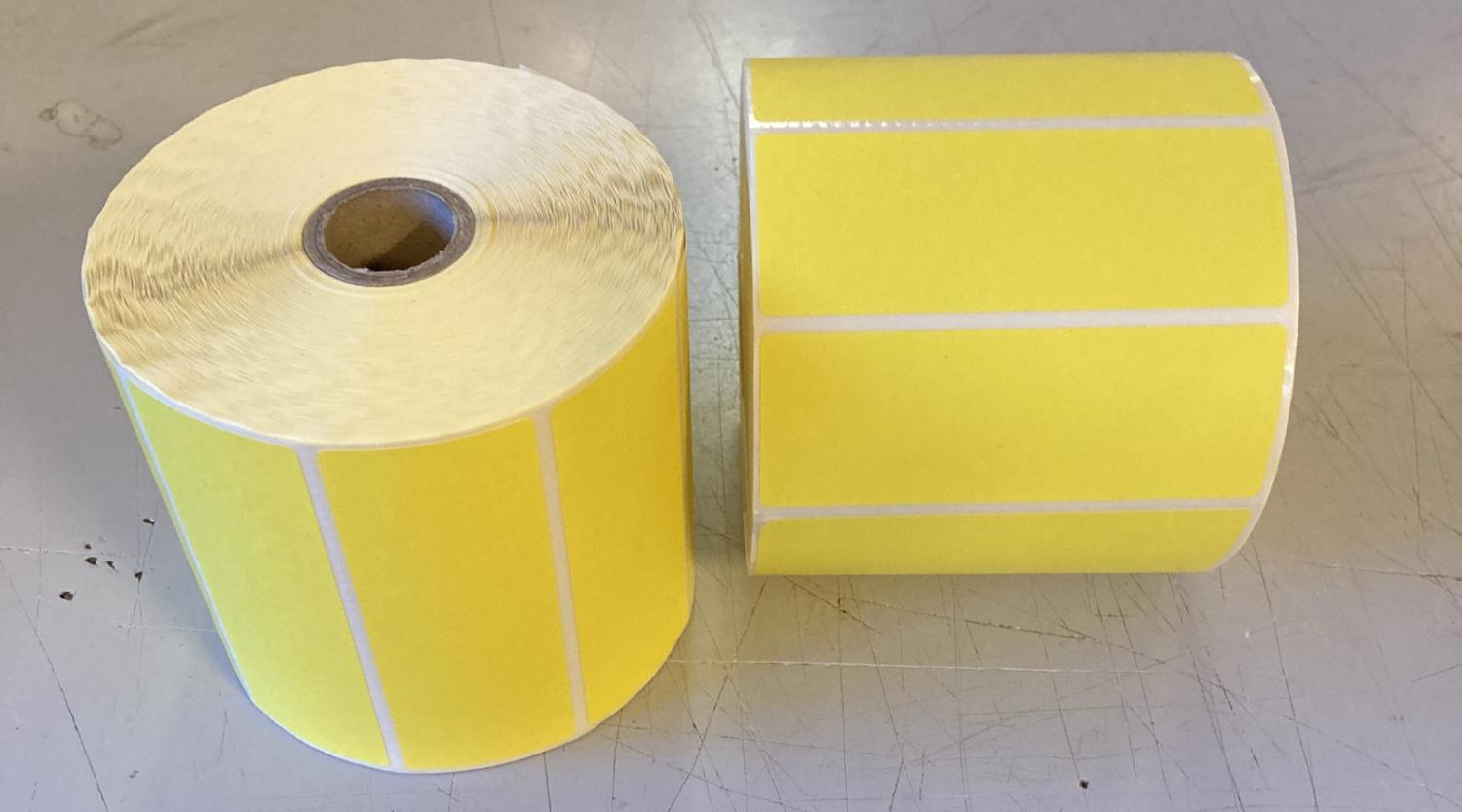 12 rullar gula märkningsetiketter för logistik, 102x38 mm, direkttermo (perforerade). Används av bl.a. DHL Freight.