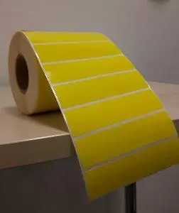 Helt gul etikett med klister av en typ som gör den avtagbar.