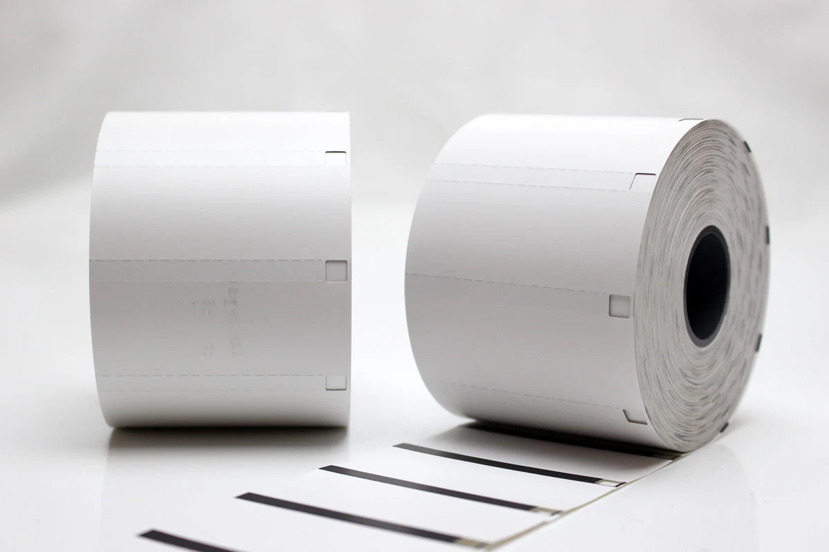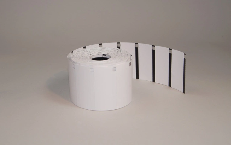 Rullen har svarta läsmärken mellan etiketterna (blackmark) och fungerar till bl.a. Zebra GK420d och andra skrivare i liknande utformning.