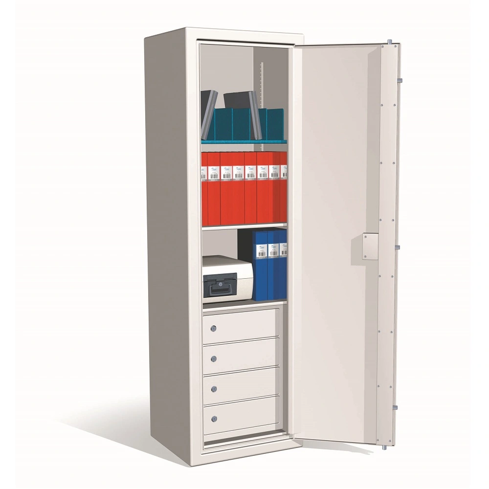 Som standard är skåpet utrustat med omställbart högsäkerhetslås klass B, certifierat enligt SS3880 och EN 1300. Som tillval finns elkodlås med svängregel. Skåpet är utrustat med flyttbara hyllor och även anpassat för enkel montering av en mängd olika inredningar (nyckelförvaring, låsbara fack, hängmappsramar, laptophållare, utdragbara hyllor med avdelare m.m).