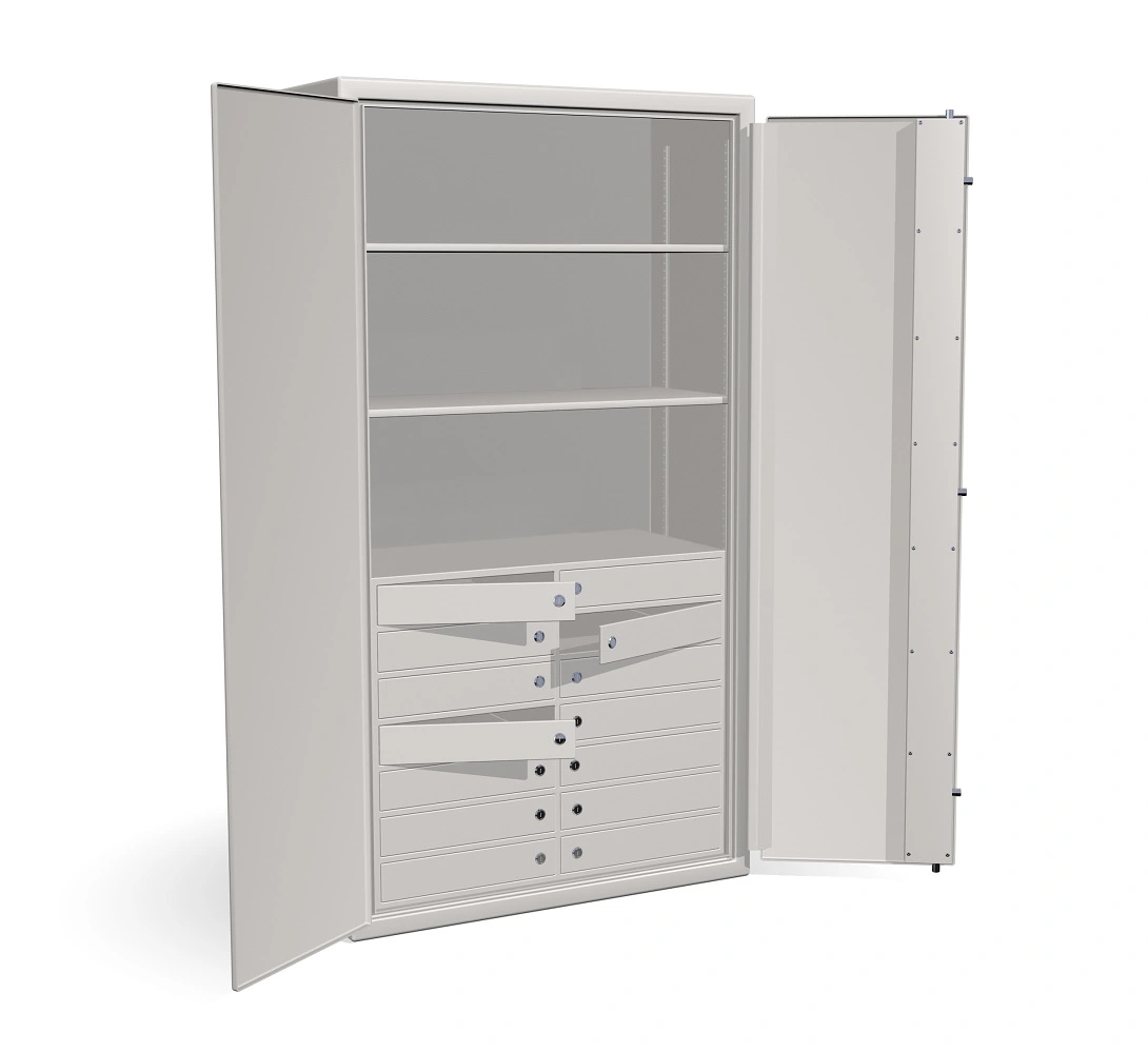Som standard är skåpet utrustat med omställbart högsäkerhetslås klass B, certifierat enligt SS3880 och EN 1300. Som tillval finns elkodlås med svängregel. Skåpet är utrustat med flyttbara hyllor och även anpassat för enkel montering av en mängd olika inredningar (nyckelförvaring, låsbara fack, hängmappsramar, laptophållare, utdragbara hyllor med avdelare m.m).