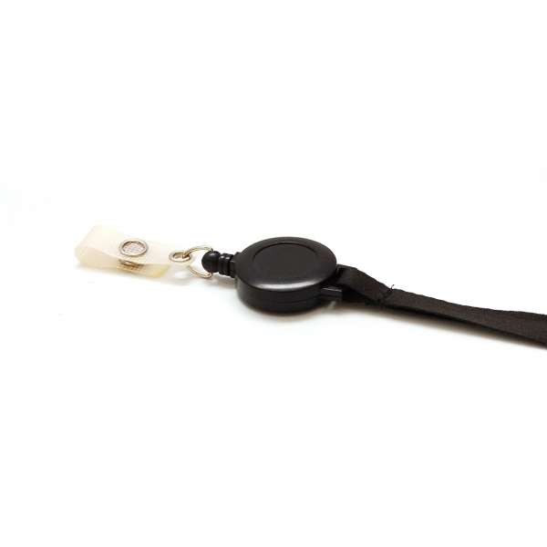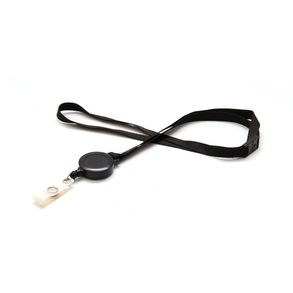 Halsband (lanyard) och jojo, för användning med ID-kortshållare och namnbrickor. Jojon har ett utdragbart clipfäste. Halsbandet är 2x43 cm långt, och linan från jojon är 72 cm.