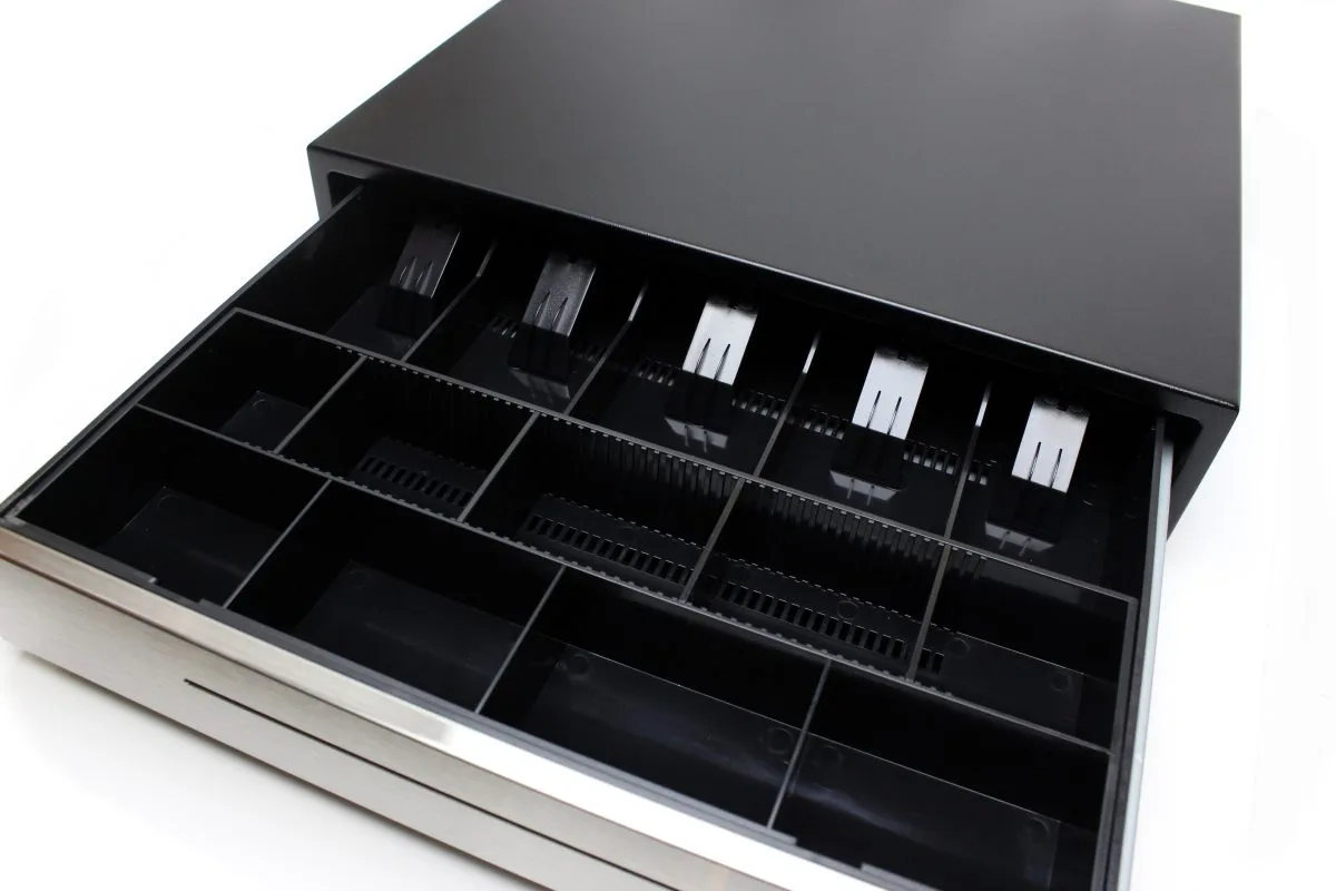 Stor manuell kassalåda från Glancetron med 5 sedelfack och 9 myntfack. Passar alla svenska sedlar. Bredd: 420 mm, höjd: 91 mm, djup: 420 mm.