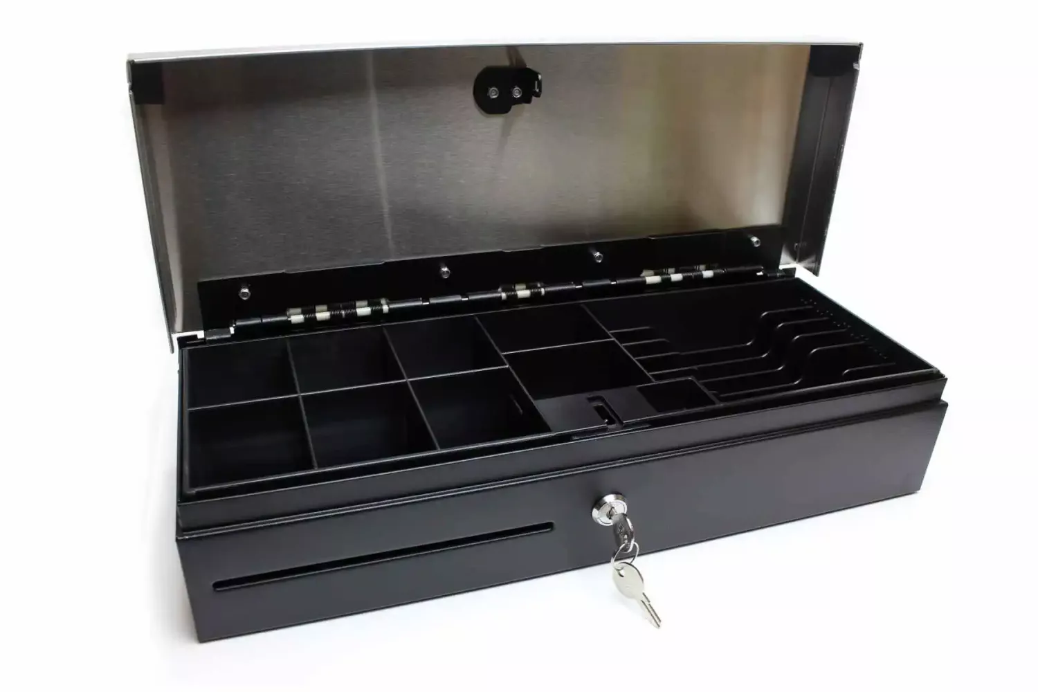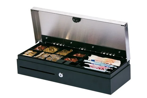 6 sedelfack och 8 myntfack, samt inkast för presentkort och checkar på fronten. Lås- och öppningsbar med nyckel. Passar de flesta kvittoskrivare.