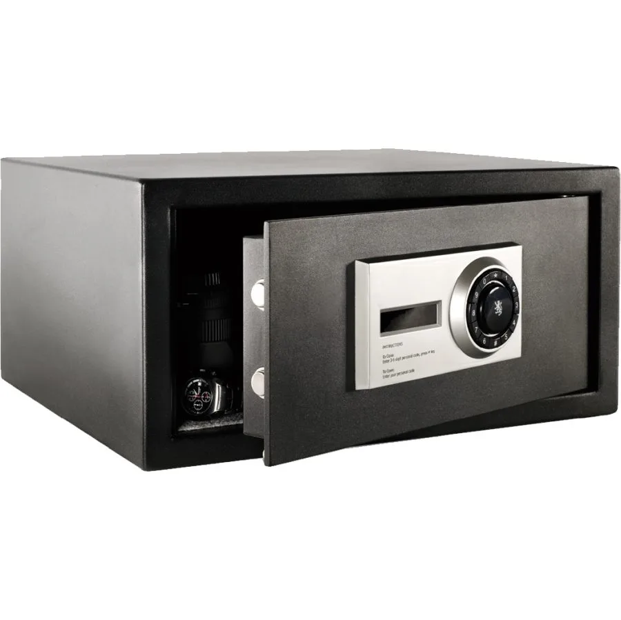 Kassaskåpet har ett motordrivet elkodlås, samt ett mekaniskt lås för nödöppning. Skåpet hanterar två koder: en huvudkod och en personlig kod. Enkel programmering mellan privat och hotell användning.