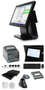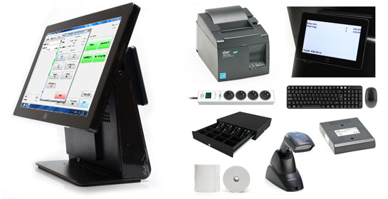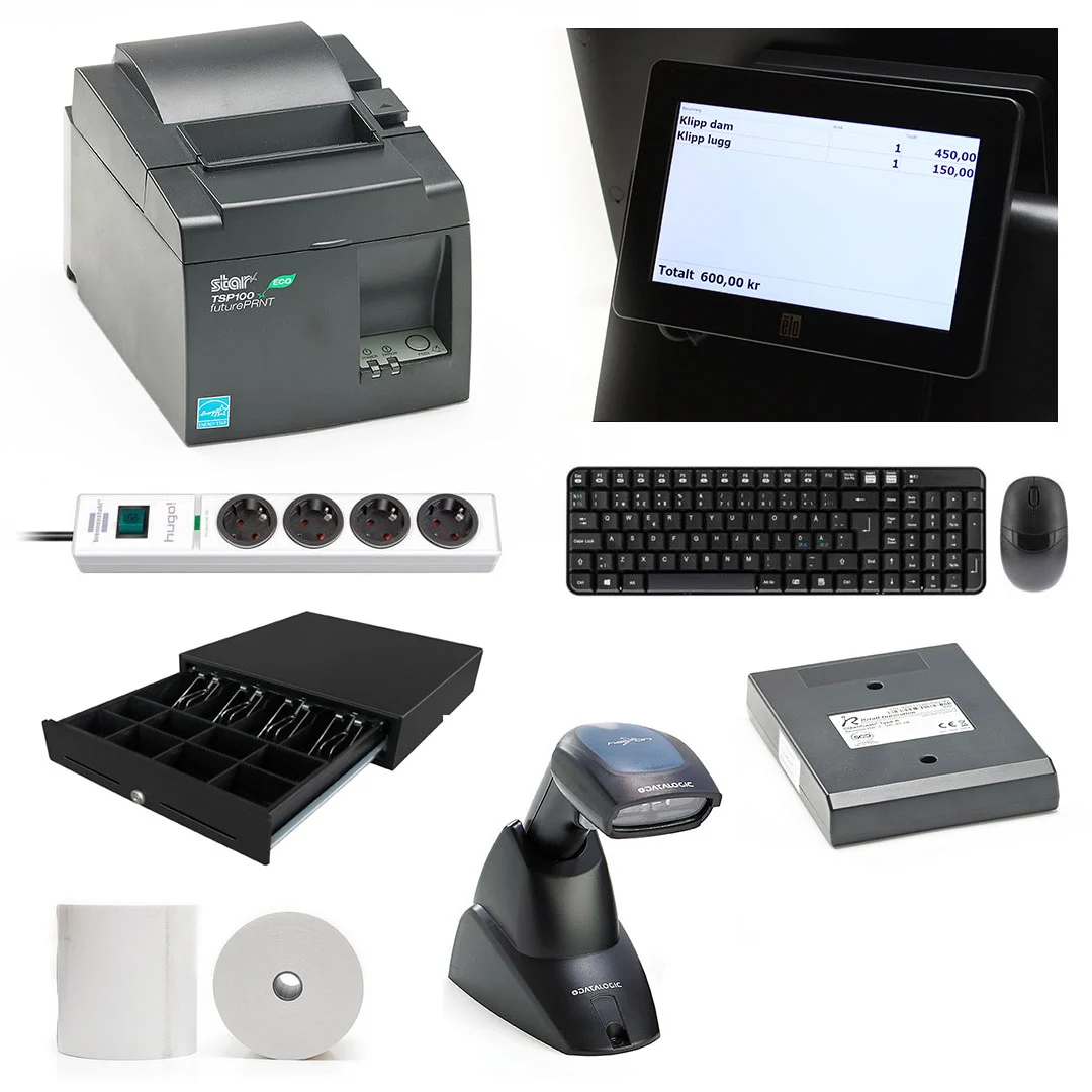 Dator med pekskärm och operativsystem, Trådlöst tangentbord & mus, Kvittoskrivare, Kontrollenhet, Streckkodsläsare, Kunddisplay, Kassalåda, Grendosa och en kartong Kvittorullar!