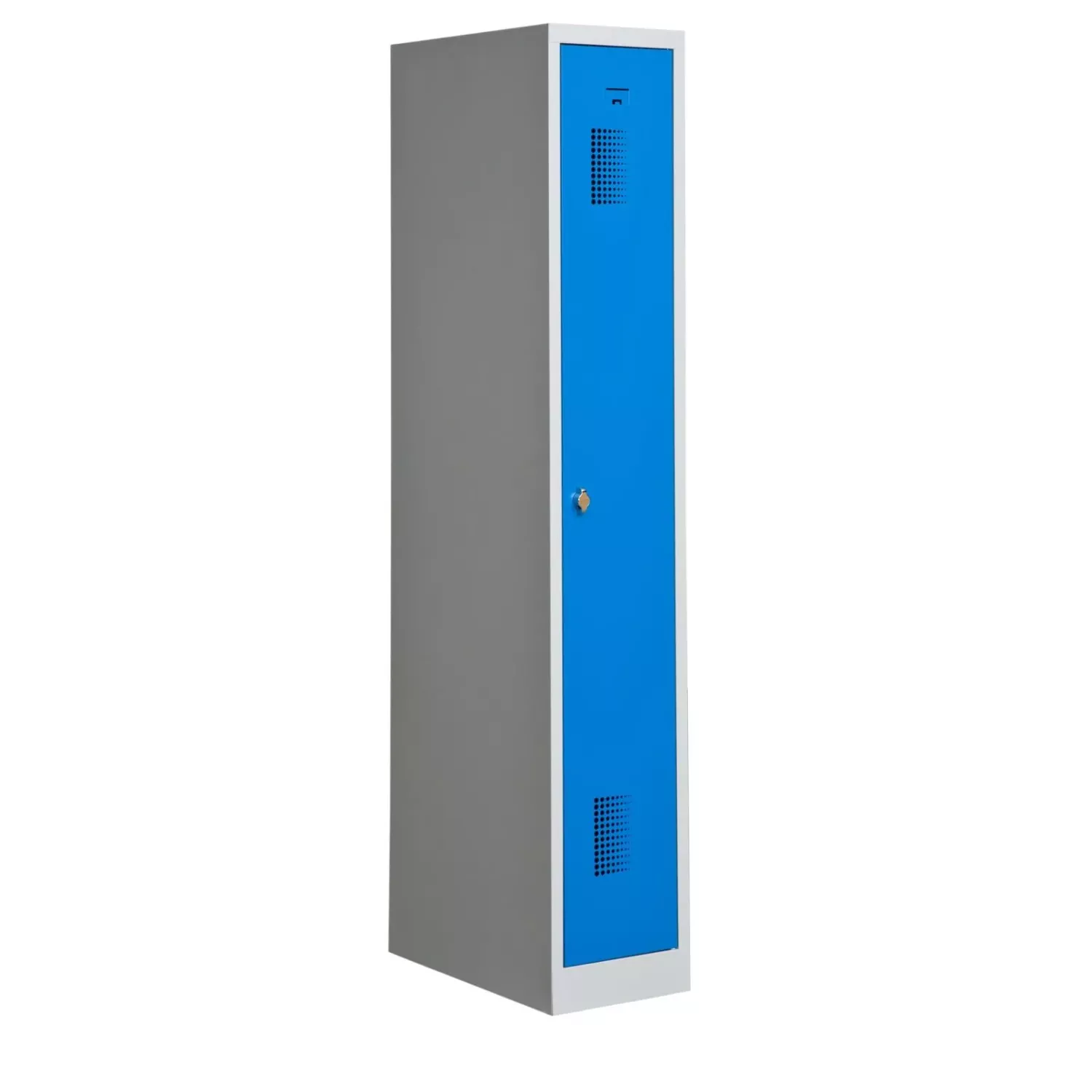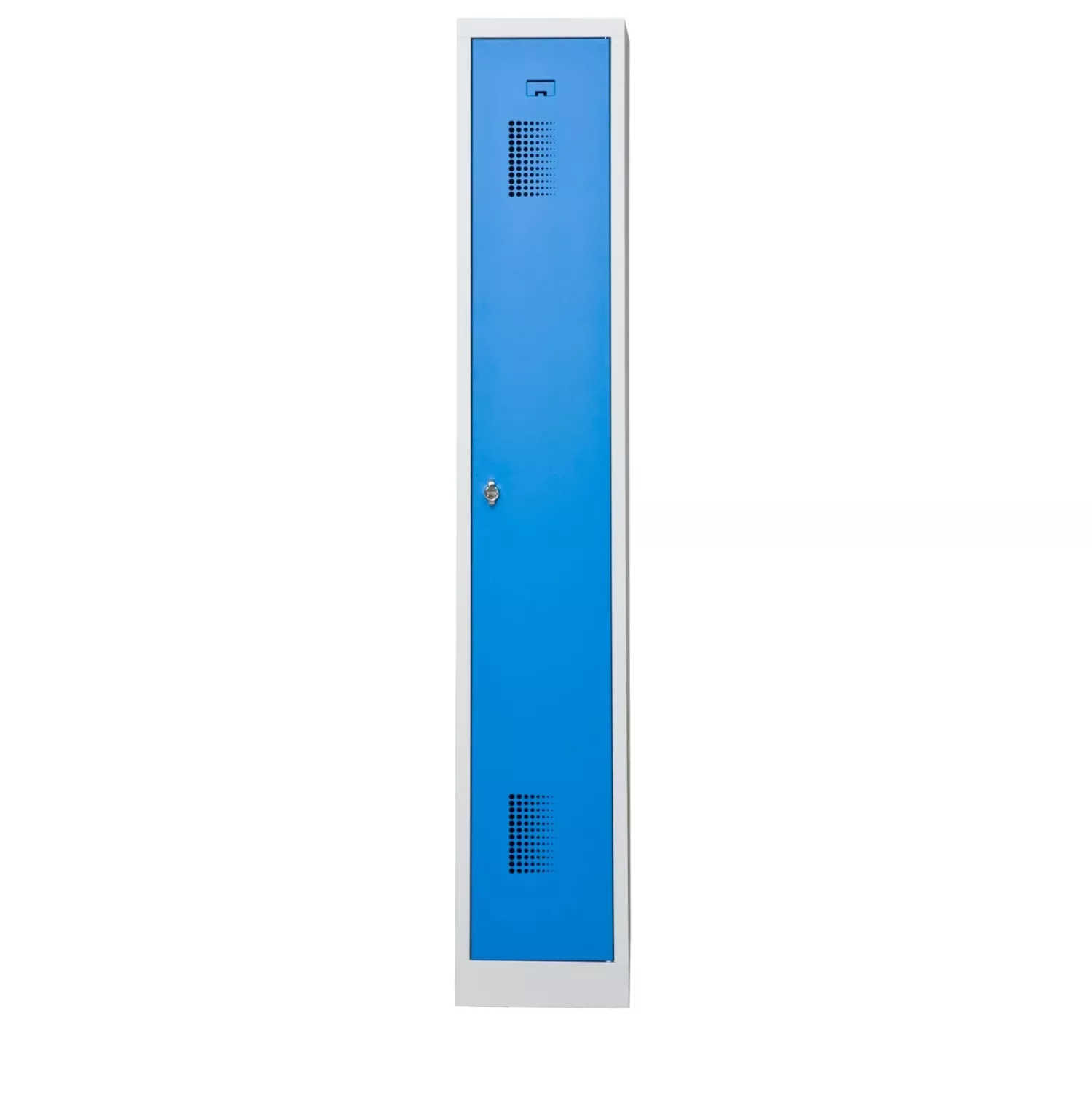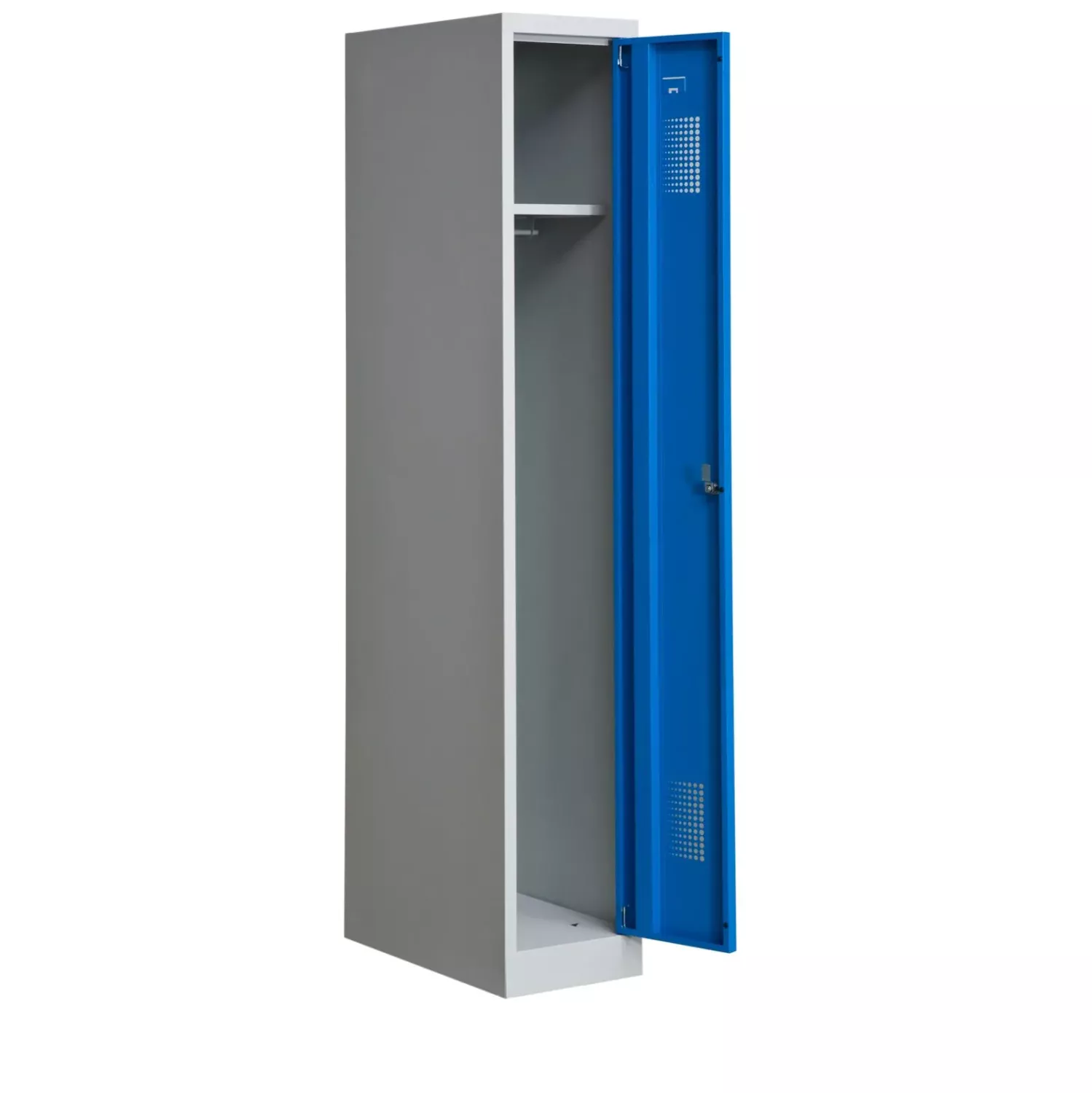Skåpstommen har en benvit beläggning (RAL 7035), och skåpdörren en trevlig blåfärg (RAL 5012) som är lätt för ögonen och indikativ för klädskåp. Även andra färger på skåpdörren går att välja ovan.