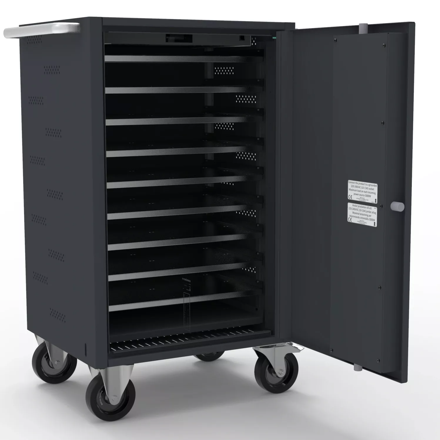 Vagnen är utrustad med kodlås, 10 st. hyllor samt grenuttag för laddning.Laptopvagn LTV 1100, rymmer 10 laptops eller 20 surfplattor/ Ipads.