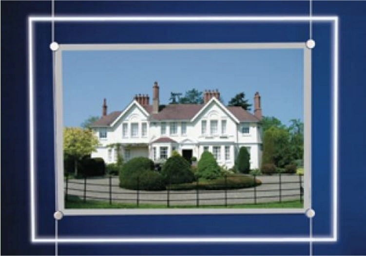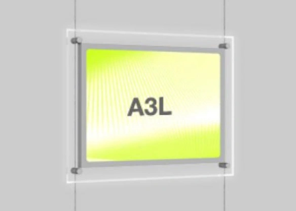 Skylten är utrustad med en snygg genomskinlig ram, där kanterna får en upplyst effekt. Skylten kan med fördel kombineras med andra skyltar för att täcka t.ex. en vägg eller ett skyltfönster.