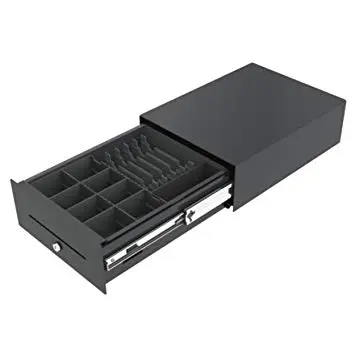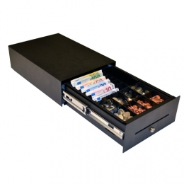 Unik kassalåda i litet format, med 6 sedelfack & 8 myntfack. Manuell och elektronisk öppning. Bredd: 275 mm, djup: 370 mm, höjd: 120 mm.