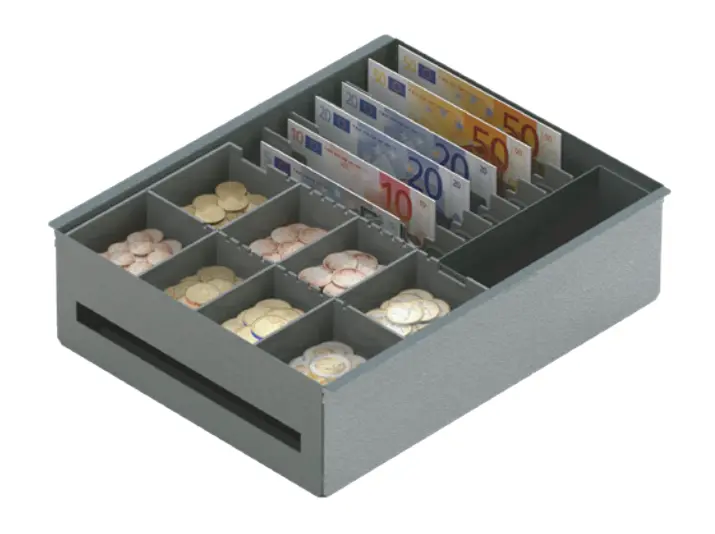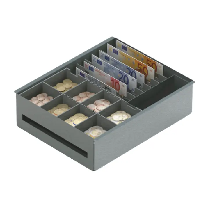 Unik kassalåda i litet format, med 6 sedelfack och 8 myntfack. Lådan är tillverkad med en robust stålkonstruktion.