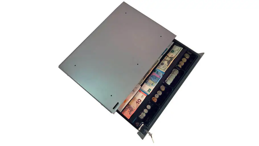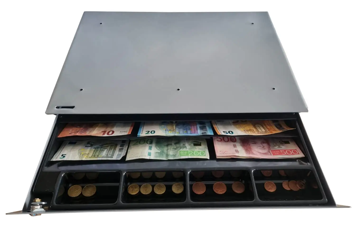 Kassalådan monteras under arbetsbänken, vilket ger mer arbetsyta framför kassapersonalen. Kassalådans insatslåda är löstagbar och har fyra myntfack och fria sedelfack. Insatslådan är tillverkad av PVC-fri svart plast, vilket gör att den är både hållbar och miljövänlig. När flera personer arbetar med samma kassa kan extra insatslådor beställas. Dessutom finns det transportlock till insatslådorna för förvaring och transport.