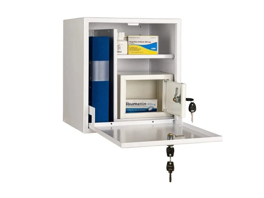 Skåpet har heldörr som öppnas framåt och som kan användas som stöd vid dosering eller som avlastningsyta. Skåpet består av två sidor avskilda med en vägg. Den vänstra sidan passar utmärkt för förvaring av t.ex. en stående A4-pärm för journaler eller viktiga dokument.