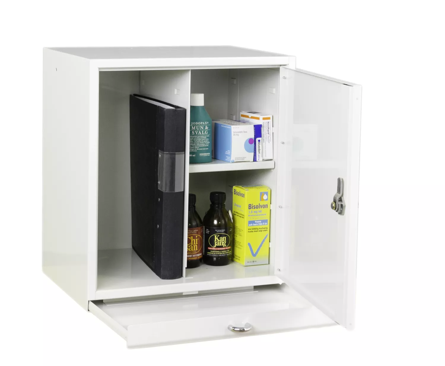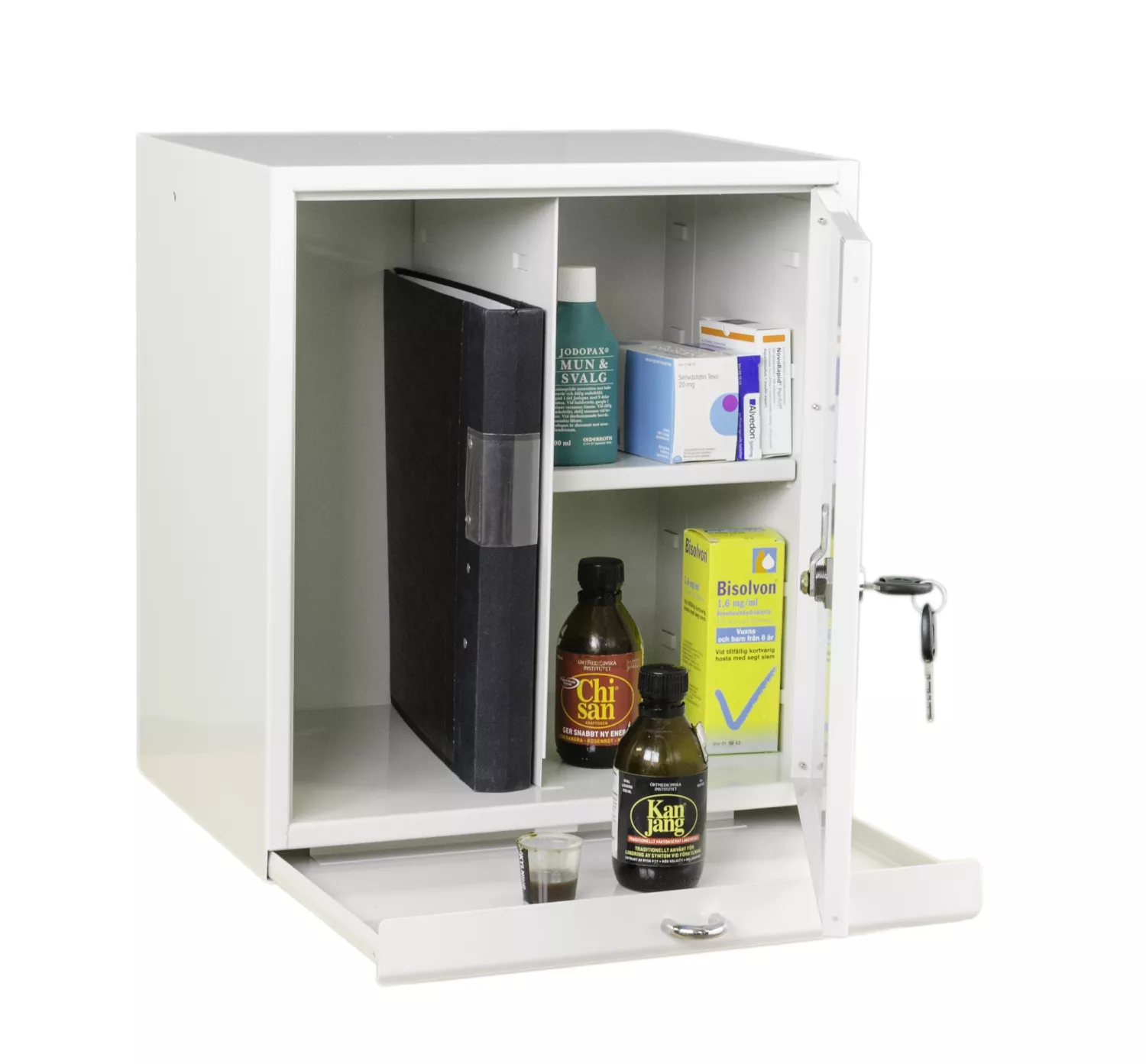 Inbrottsfördröjande medicinskåp som utrustats med en utdragbar avlastningshylla att användas som arbetsyta vid dosering av mediciner.