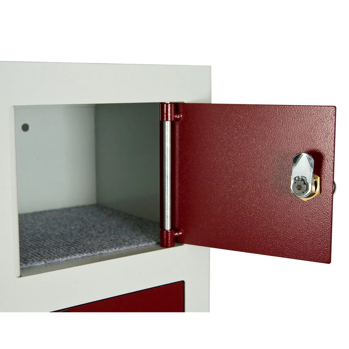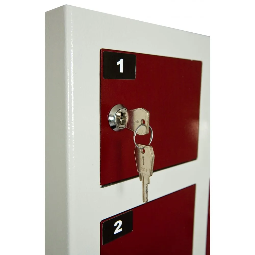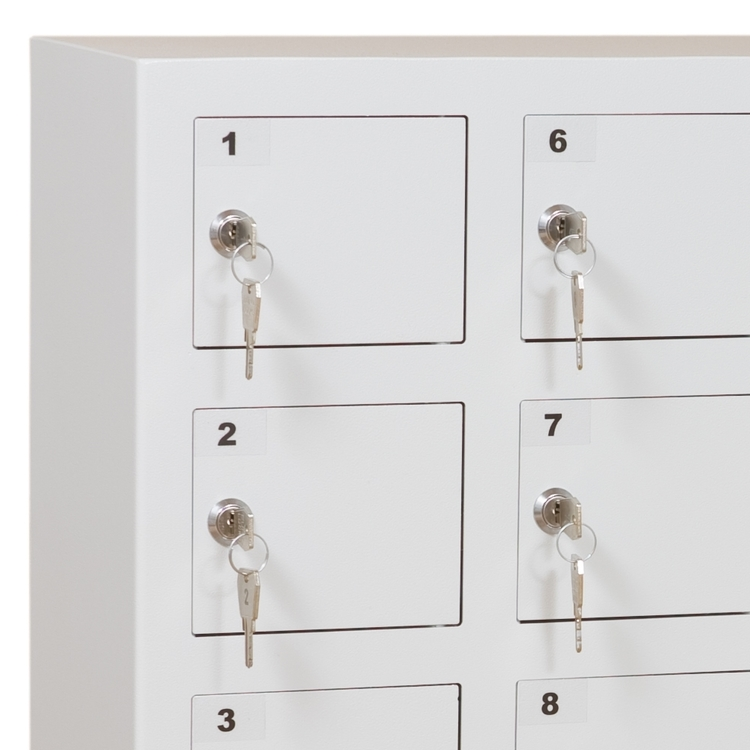De enskilda facken är utrustade med separata cylinderlås som alla kan öppnas med en huvudnyckel. Varje lucka är inredd med en matta som skyddar telefonen.