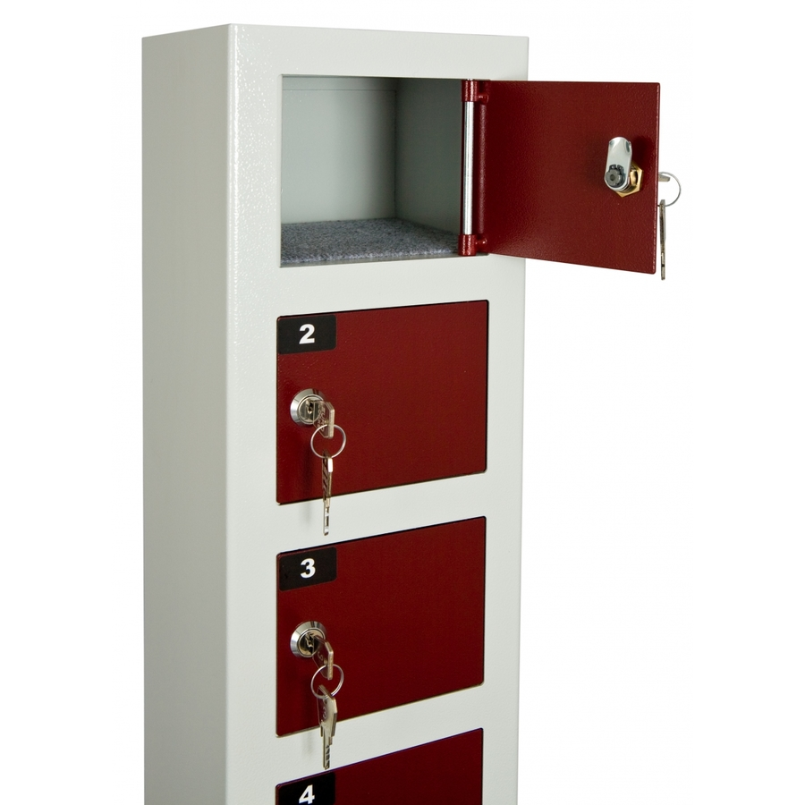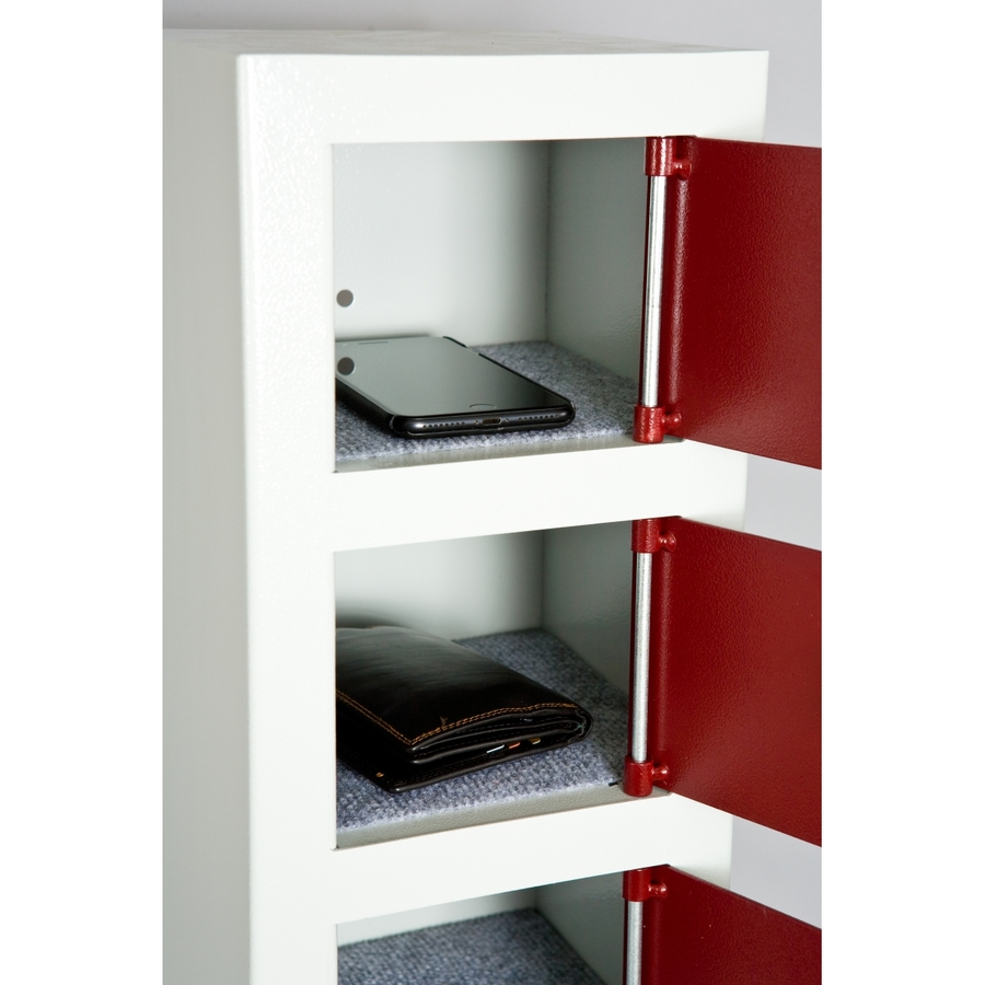 De enskilda facken är utrustade med separata cylinderlås som alla kan öppnas med en huvudnyckel. Varje lucka är inredd med en matta som skyddar telefonen.