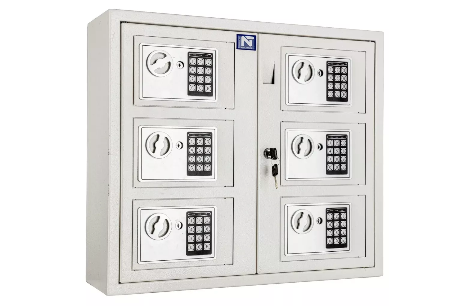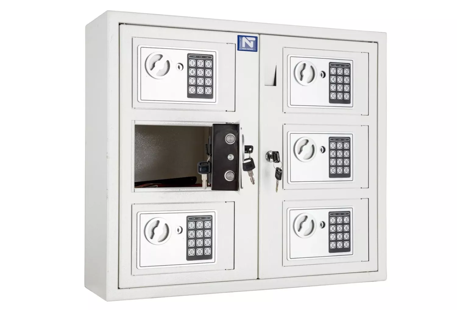 NTS-6 är ett litet men rymligt småfacksskåp för mobiler och surfplattor, där varje användare kan välja sin egen kod för sin lucka. En fysisk nyckel medföljer till varje individuellt fack. Skåpet är även utrustat med ett nyckellås för nödöppning som öppnar hela skåpet.